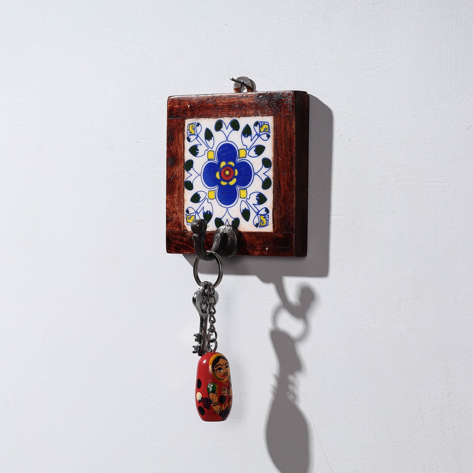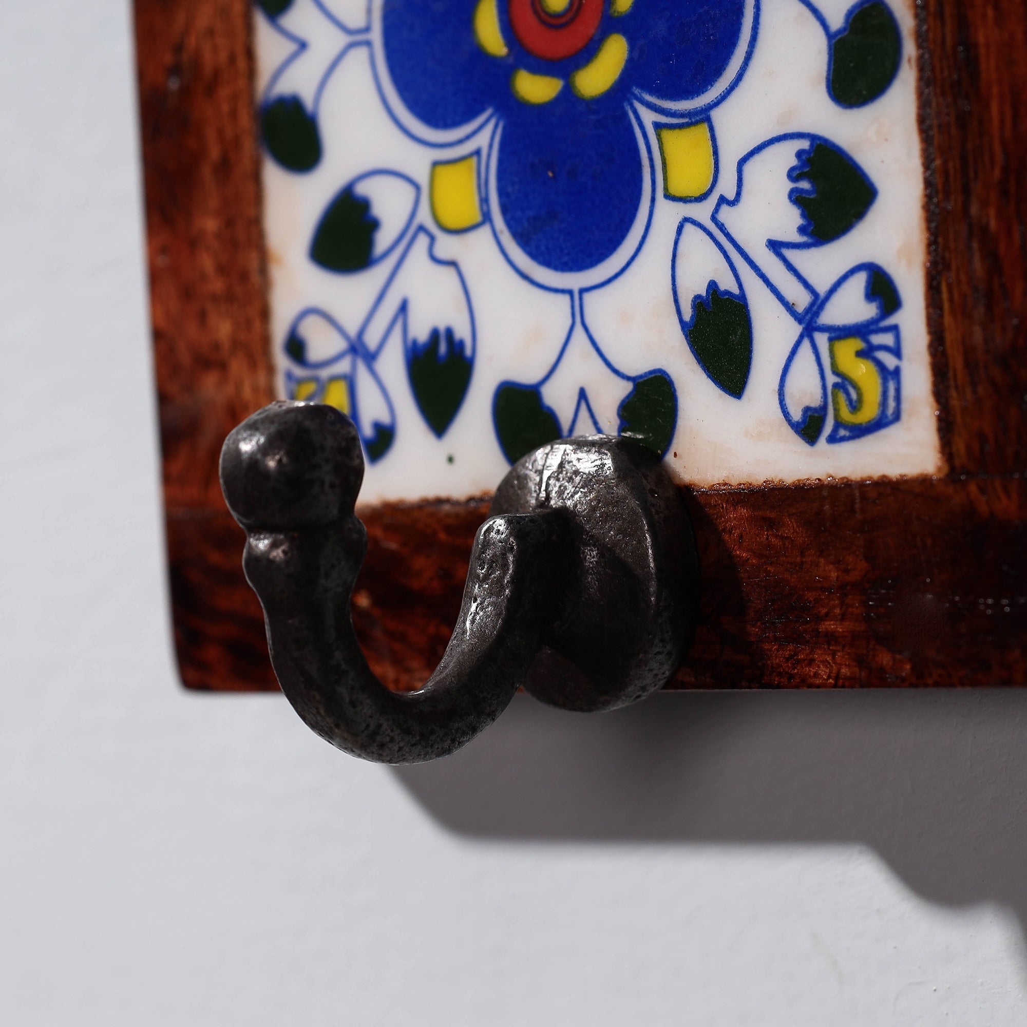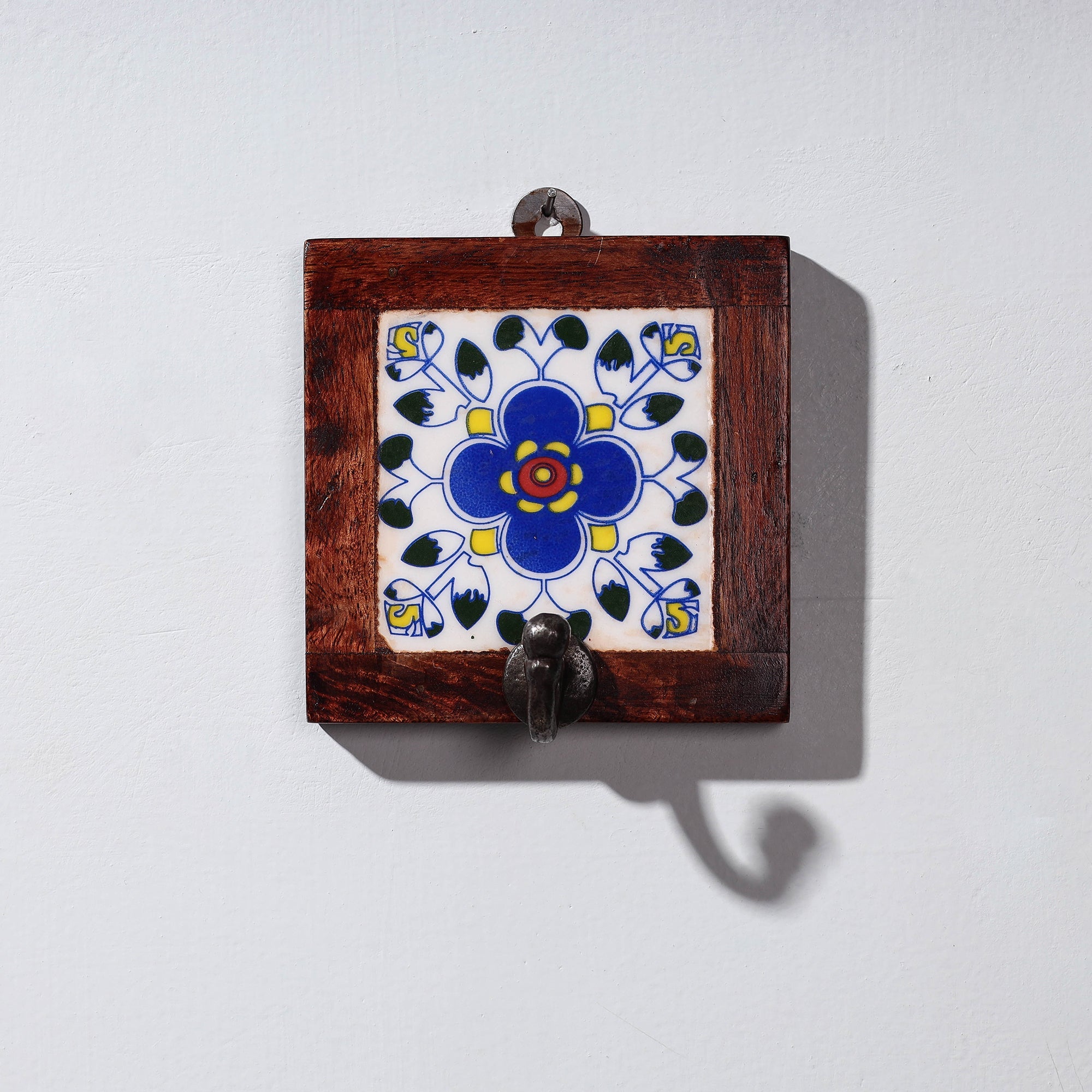 This white wall hanger is crafted from blue pottery ceramic tile & iron rod. It has 1 peg for hanging keys, coat, towel or any clothing, has one wall mount hook on the back for easy hanging. Blue Pottery is widely recognized as a traditional craft of Jaipur, though it is Turko-Persian in origin. The name 'blue pottery' comes from the eye-catching blue dye used to color the pottery. Jaipur blue pottery, made out of a similar frit material to Egyptian faience, is glazed and low-fired. No clay is used: the 'dough' for the pottery is prepared by mixing quartz stone powder, powdered glass, Multani Mitti (Fuller's Earth), borax, gum and water. It is the only pottery in the world that does not use clay.