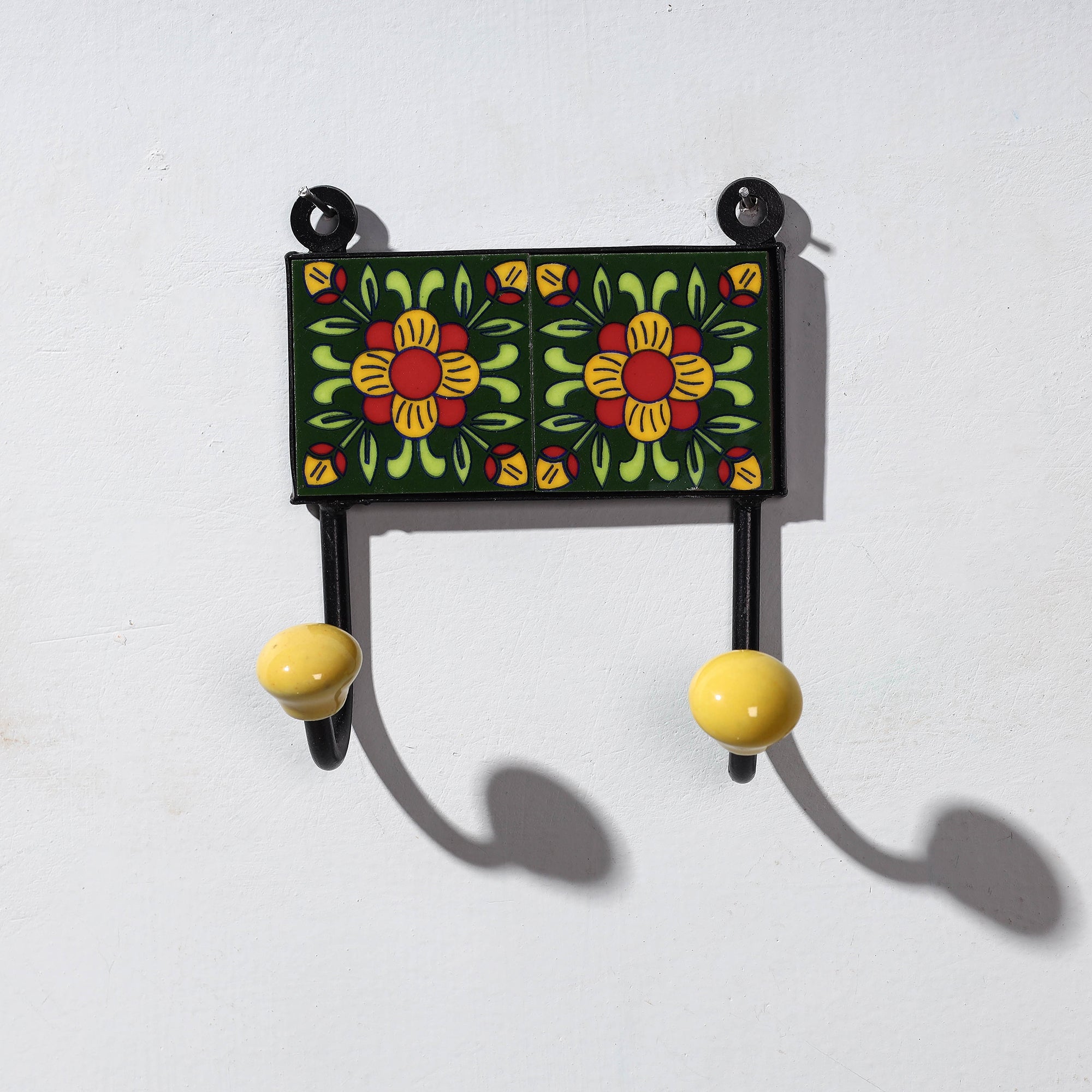 This green wall hanger is crafted from blue pottery ceramic tile & iron rod. It has 2 peg for hanging keys, coat, towel or any clothing, has one wall mount hook on the back for easy hanging. Blue Pottery is widely recognized as a traditional craft of Jaipur, though it is Turko-Persian in origin. The name 'blue pottery' comes from the eye-catching blue dye used to color the pottery. Jaipur blue pottery, made out of a similar frit material to Egyptian faience, is glazed and low-fired. No clay is used: the 'dough' for the pottery is prepared by mixing quartz stone powder, powdered glass, Multani Mitti (Fuller's Earth), borax, gum and water. It is the only pottery in the world that does not use clay.