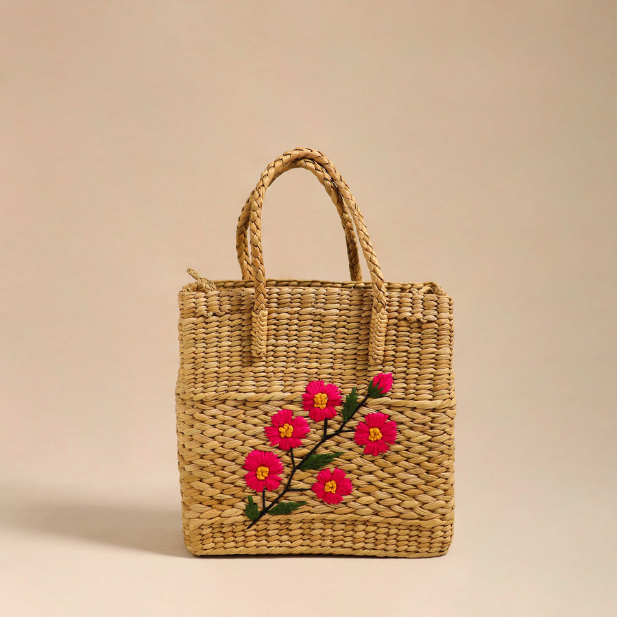 This exquisite beige handcrafted shopping bag from Manipur is made of natural water reed and adorned with intricate hand embroidery. The bag showcases the rich cultural heritage of Manipur, known for its traditional craftsmanship. Made from durable and eco-friendly water reed, the bag is perfect for everyday use. It offers ample space for groceries, books, or as a stylish alternative to plastic bags. The vibrant hand embroidery adds an artistic touch, depicting traditional patterns and nature-inspired designs. With sturdy handles and a secure closure, this bag combines traditional charm with contemporary style, making it a versatile and fashionable accessory for any occasion.