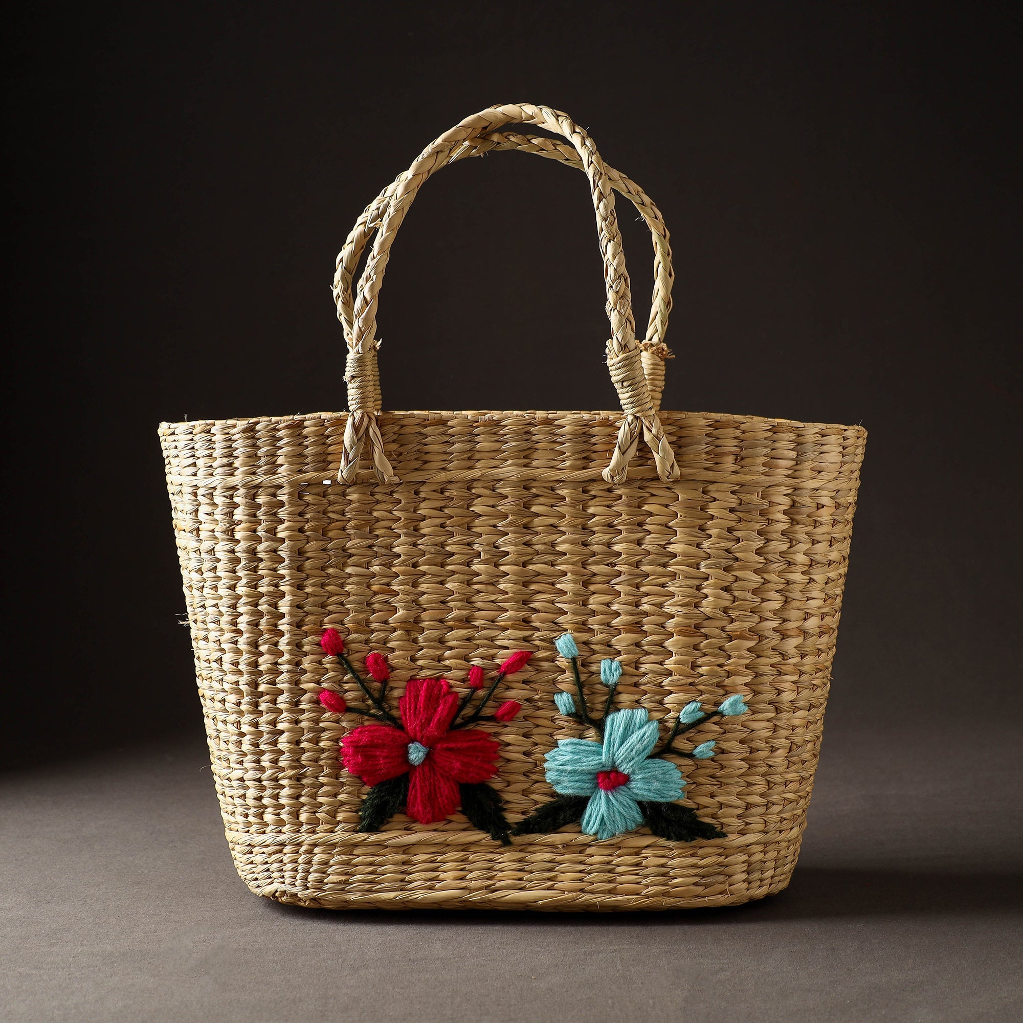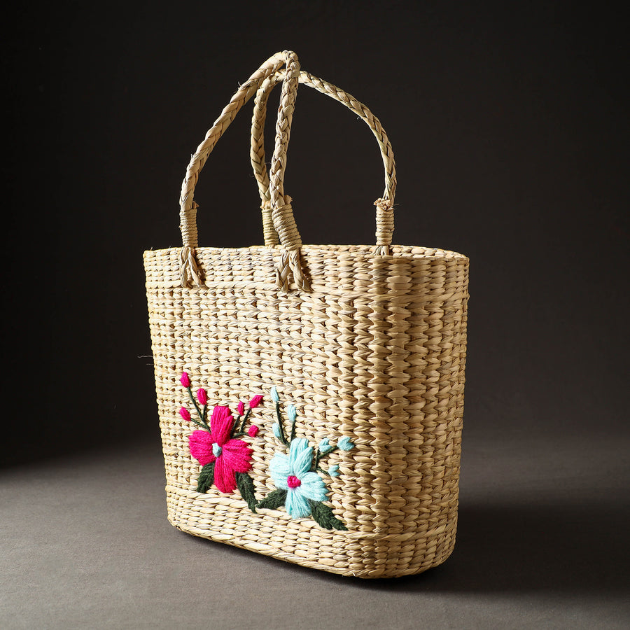 This exquisite beige handcrafted shopping bag from manipur is made of natural water reed and adorned with intricate hand embroidery. The bag showcases the rich cultural heritage of Manipur, known for its traditional craftsmanship. Made from durable and eco-friendly water reed, the bag is perfect for everyday use. It offers ample space for groceries, books, or as a stylish alternative to plastic bags. The vibrant hand embroidery adds an artistic touch, depicting traditional patterns and nature-inspired designs. With sturdy handles and a secure closure, this bag combines traditional charm with contemporary style, making it a versatile and fashionable accessory for any occasion.