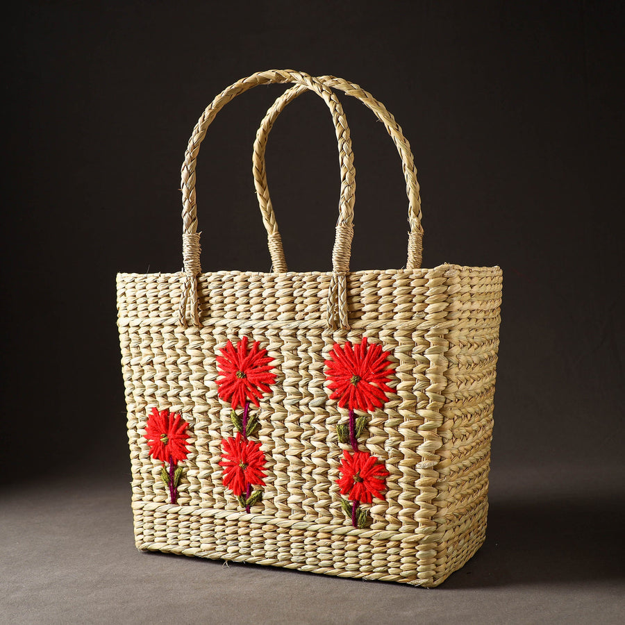 This exquisite beige handcrafted shopping bag from manipur is made of natural water reed and adorned with intricate hand embroidery. The bag showcases the rich cultural heritage of Manipur, known for its traditional craftsmanship. Made from durable and eco-friendly water reed, the bag is perfect for everyday use. It offers ample space for groceries, books, or as a stylish alternative to plastic bags. The vibrant hand embroidery adds an artistic touch, depicting traditional patterns and nature-inspired designs. With sturdy handles and a secure closure, this bag combines traditional charm with contemporary style, making it a versatile and fashionable accessory for any occasion.