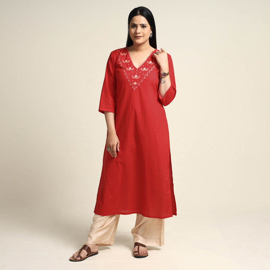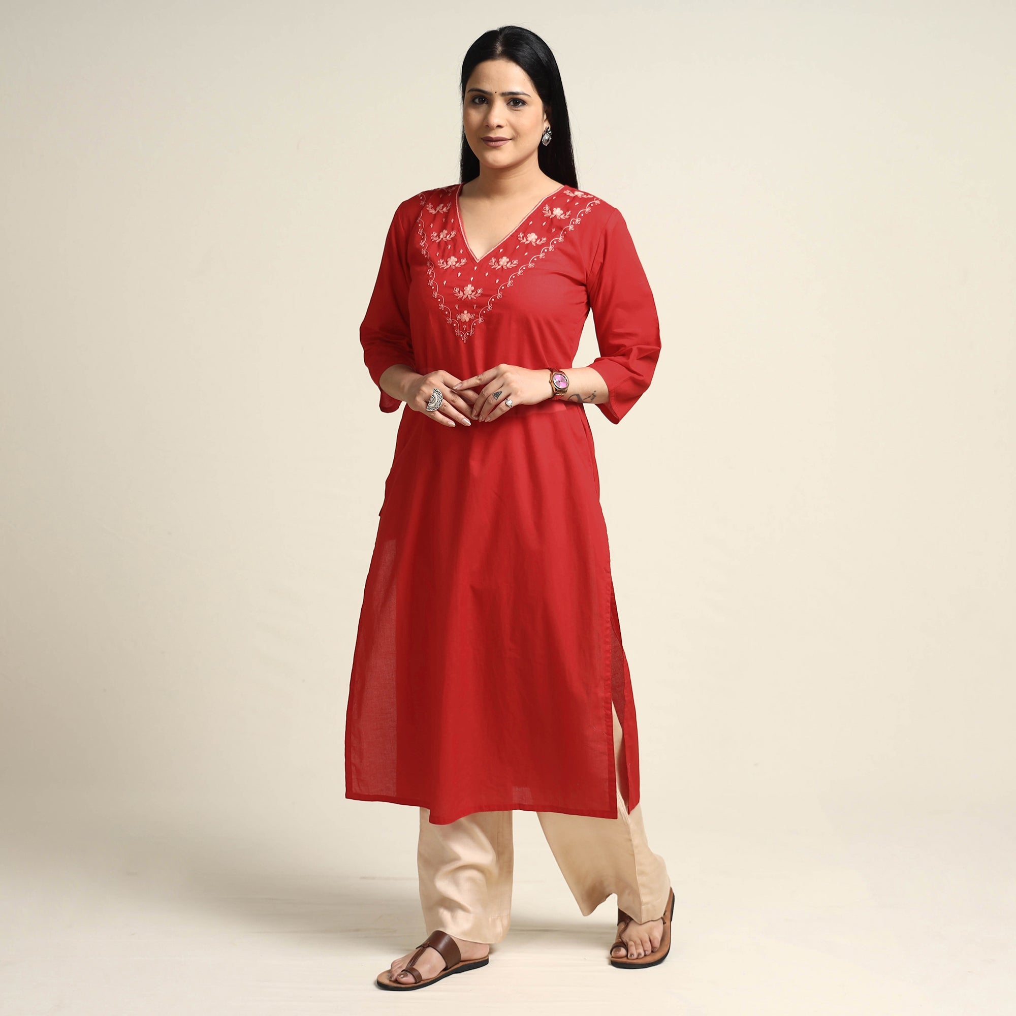 This plain dyed hand embroidery cotton long kurti is a perfect blend of style and comfort. It features a one-side pocket and is made from cotton fabric, ensuring ease and comfort throughout the day. The hand embroidery adds a touch of elegance and uniqueness to the kurti. This cotton kurti makes you comfortable all day long. Upgrade your wardrobe with this versatile and fashionable kurti.