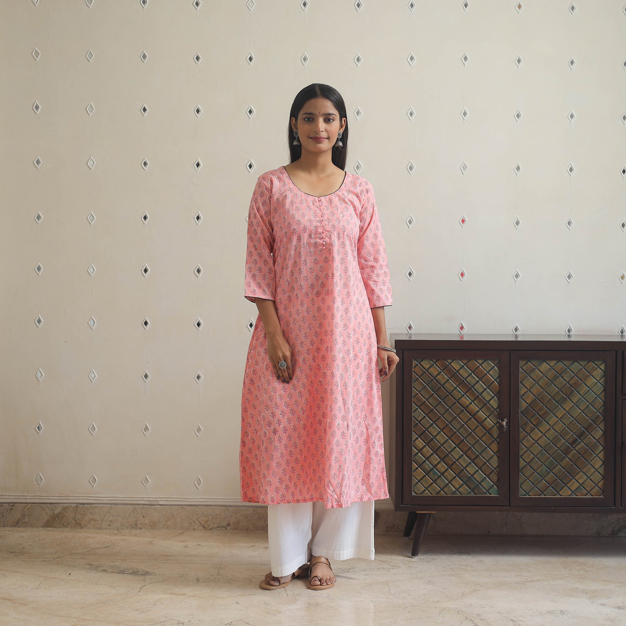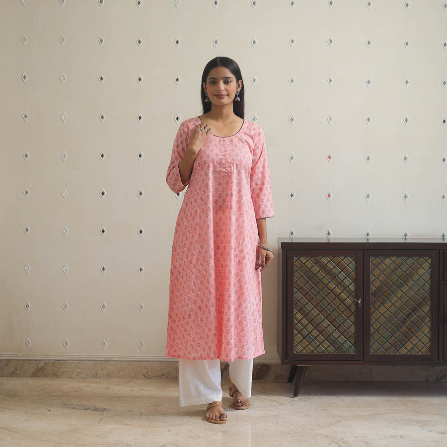Look and feel beautiful in this uniquely designed pink block print cotton a-line sanganeri kurta with one side pocket. This cotton kurta makes you comfortable with ease all day long. Sanganeri is a hand-block printing technique originating from Sanganer, a village in the southern part of Jaipur, Rajasthan. Bleed free VAT dyes used.