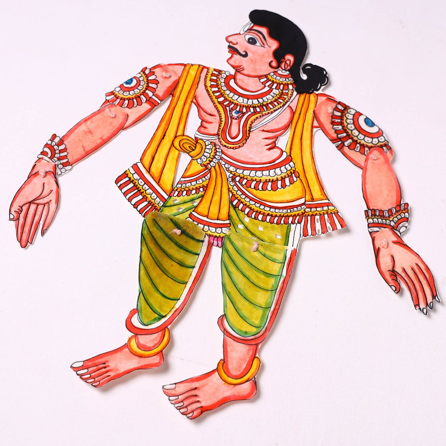 Handpainted Tholu Bommalata leather wall frame from Andhra Pradesh. Material used - leather, hard board, camlin colors. Tholu Bommalata is the shadow puppet theatre tradition of the state of Andhra Pradesh in India. Tholu bommalata literally means "the dance of leather puppets" (tholu – "leather" and bommalata – "puppet dance") is a 2000 year old craft and is one of the oldest form of performing arts.. The traditional process of crafting shadow puppets requires 30-40 days, from the procurement of leather to the completion of the product. Two other kinds of shadow puppetry are practiced in Andhra Pradesh, the Sutram Bommalata (String puppets) and the Koyya Bommalata(Wooden puppets). The leather puppets, because of their transparency and jewel like glow, are most popular. The puppets are mounted in the middle on a palm stem, extended to form a handle used to move the body of the puppet. The puppets are painted with hands using camlin colours. But apart from the translucency and vivid colours, what gives these puppets their brilliance, is the perforated designs drawn on the characters to depict jewellery. Once surrounded by colour and viewed against the light, they look like glowing jewels.
