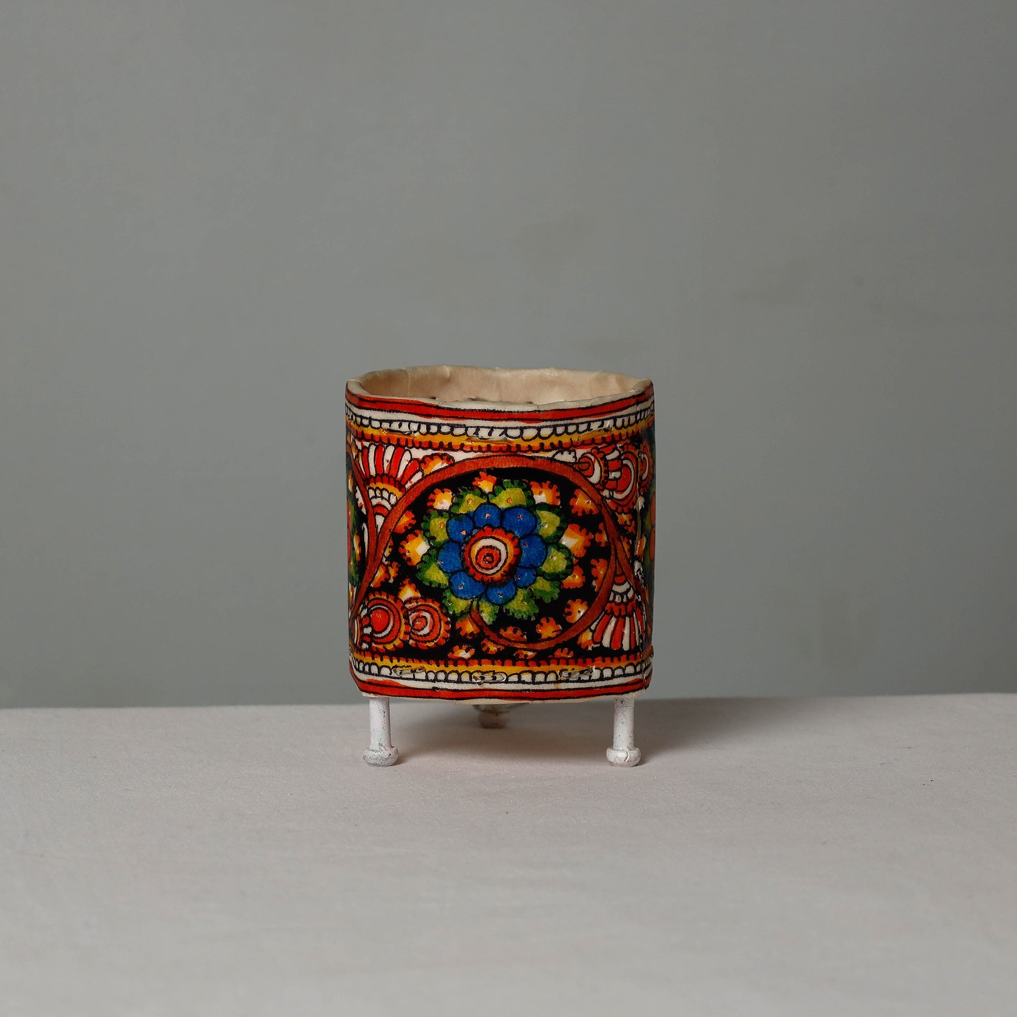 | Material | Handpainted Tholu Bommalata leather table top/side lamp from Andhra Pradesh. Material used - leather, iron frame, camlin colors, bulb holder with plug and wire.Tholu Bommalata is the shadow puppet theatre tradition of the state of Andhra Pradesh in India. Tholu bommalata literally means "the dance of leather puppets" (tholu – "leather" and bommalata – "puppet dance") is a 2000 year old craft and is one of the oldest form of performing arts.. The traditional process of crafting shadow puppets requires 30-40 days, from the procurement of leather to the completion of the product. Two other kinds of shadow puppetry are practiced in Andhra Pradesh, the Sutram Bommalata (String puppets) and the Koyya Bommalata(Wooden puppets). The leather puppets, because of their transparency and jewel like glow, are most popular. The puppets are mounted in the middle on a palm stem, extended to form a handle used to move the body of the puppet. The puppets are painted with hands using camlin colours. But apart from the translucency and vivid colours, what gives these puppets their brilliance, is the perforated designs drawn on the characters to depict jewellery. Once surrounded by colour and viewed against the light, they look like glowing jewels. |