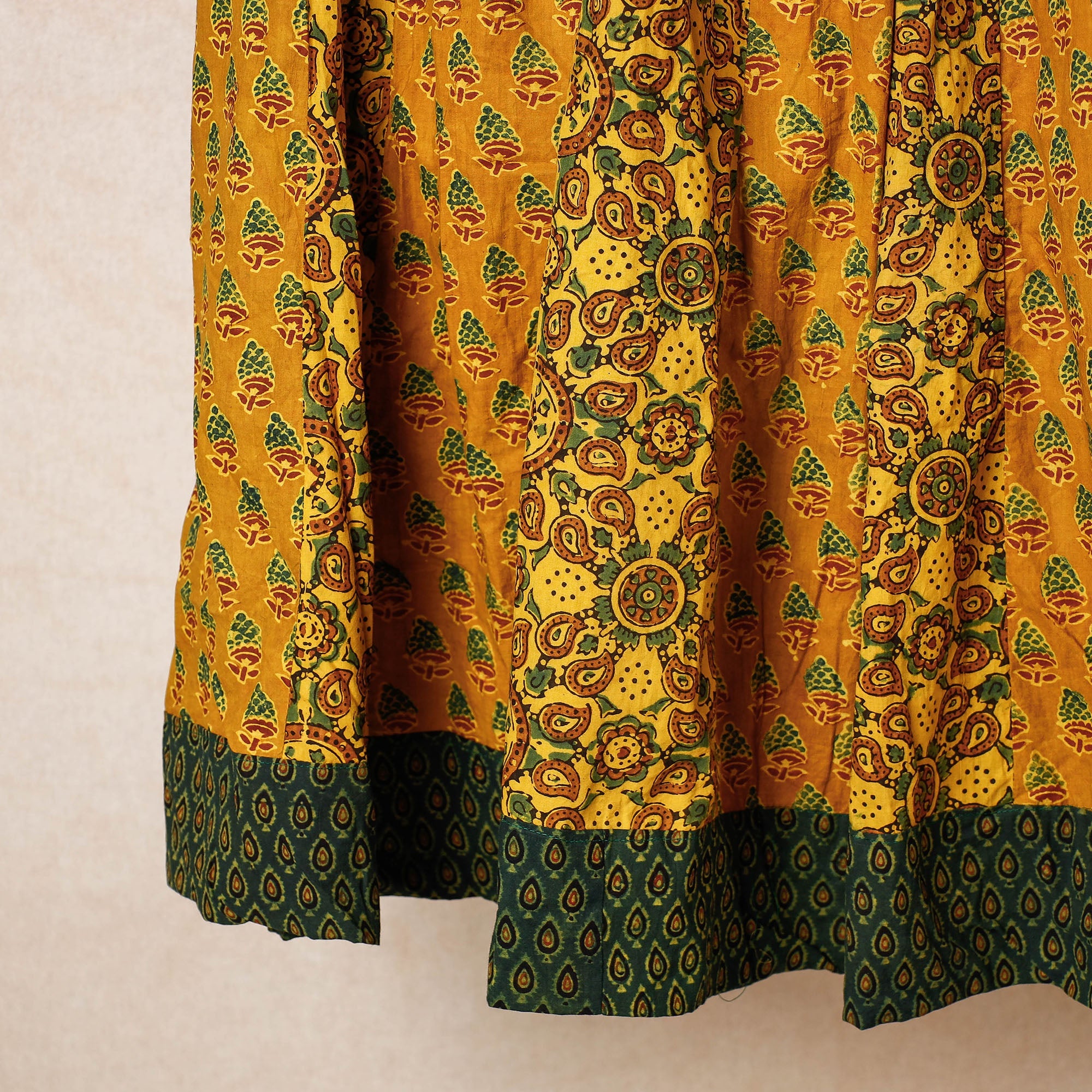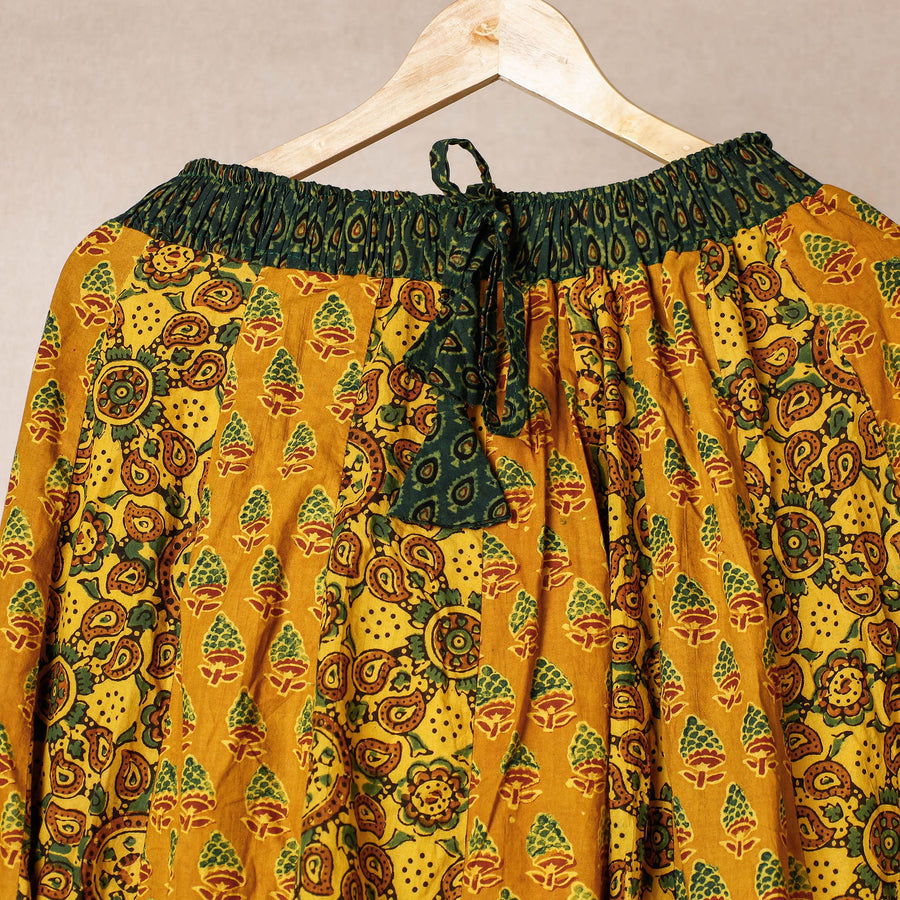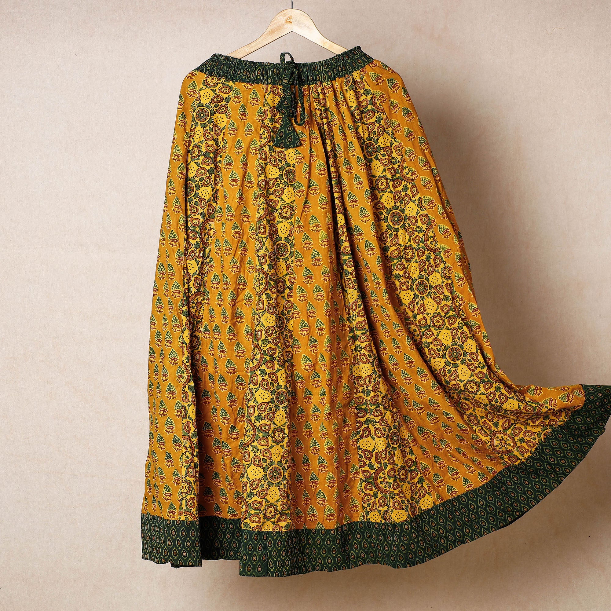 This exquisite yellow patchwork cotton long skirt is crafted from ajrakh block-printed, natural-dyed cotton fabric. This skirt boasts a waist tie-up closure, allowing for a customized and comfortable fit. The patchwork kali design adds a unique touch, showcasing the skilled craftsmanship behind its creation. The natural dyes used in the printing process enhance the overall beauty of the garment. The intricate patterns and vibrant colours reflect the cultural heritage of Gujarat. Perfect for both casual and semi-formal occasions.