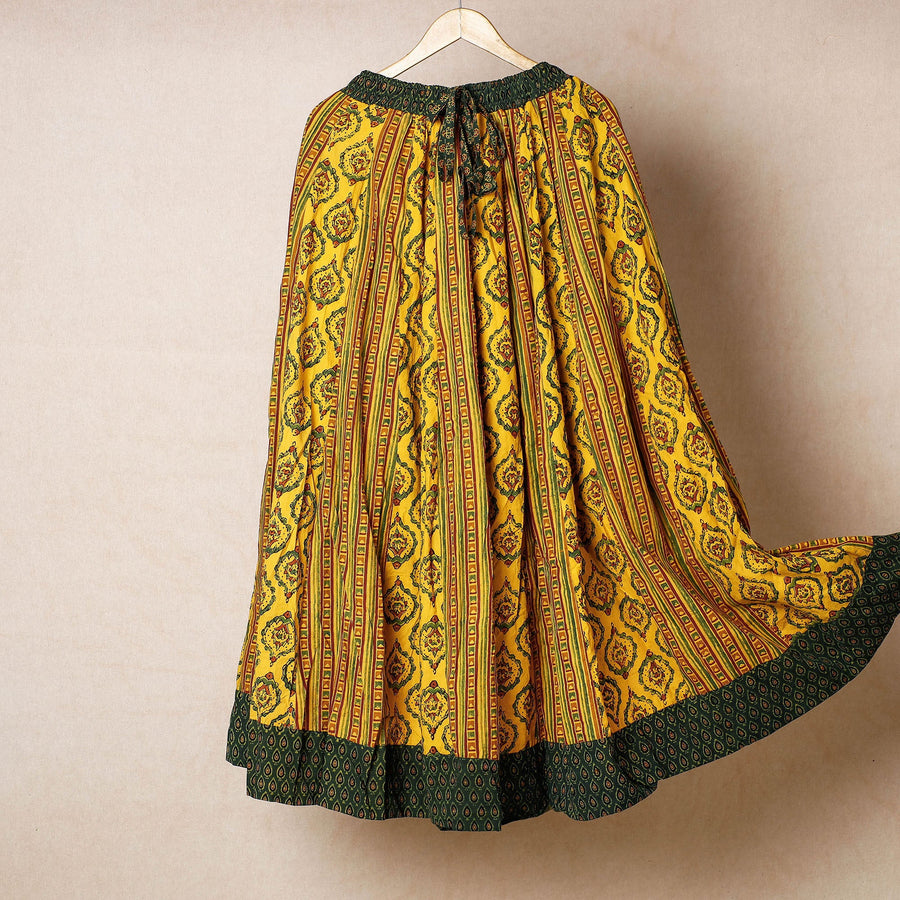 This exquisite yellow patchwork cotton long skirt is crafted from ajrakh block-printed, natural-dyed cotton fabric. This skirt boasts a waist tie-up closure, allowing for a customized and comfortable fit. The patchwork kali design adds a unique touch, showcasing the skilled craftsmanship behind its creation. The natural dyes used in the printing process enhance the overall beauty of the garment. The intricate patterns and vibrant colours reflect the cultural heritage of Gujarat. Perfect for both casual and semi-formal occasions.