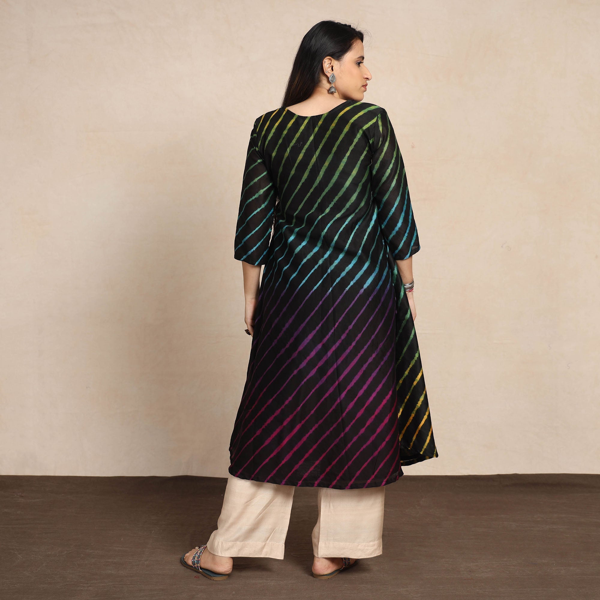 This leheriya tie-dye chanderi silk long kurta is made from high-quality chanderi silk, known for its luxurious texture and elegant sheen. The kurta features a unique leheriya tie-dye design, adding a touch of artistic flair. It also comes with a side pocket, offering convenience and functionality. This silk kurta makes you comfortable all day long. This kurta is a versatile choice for both daily outings and special occasions.