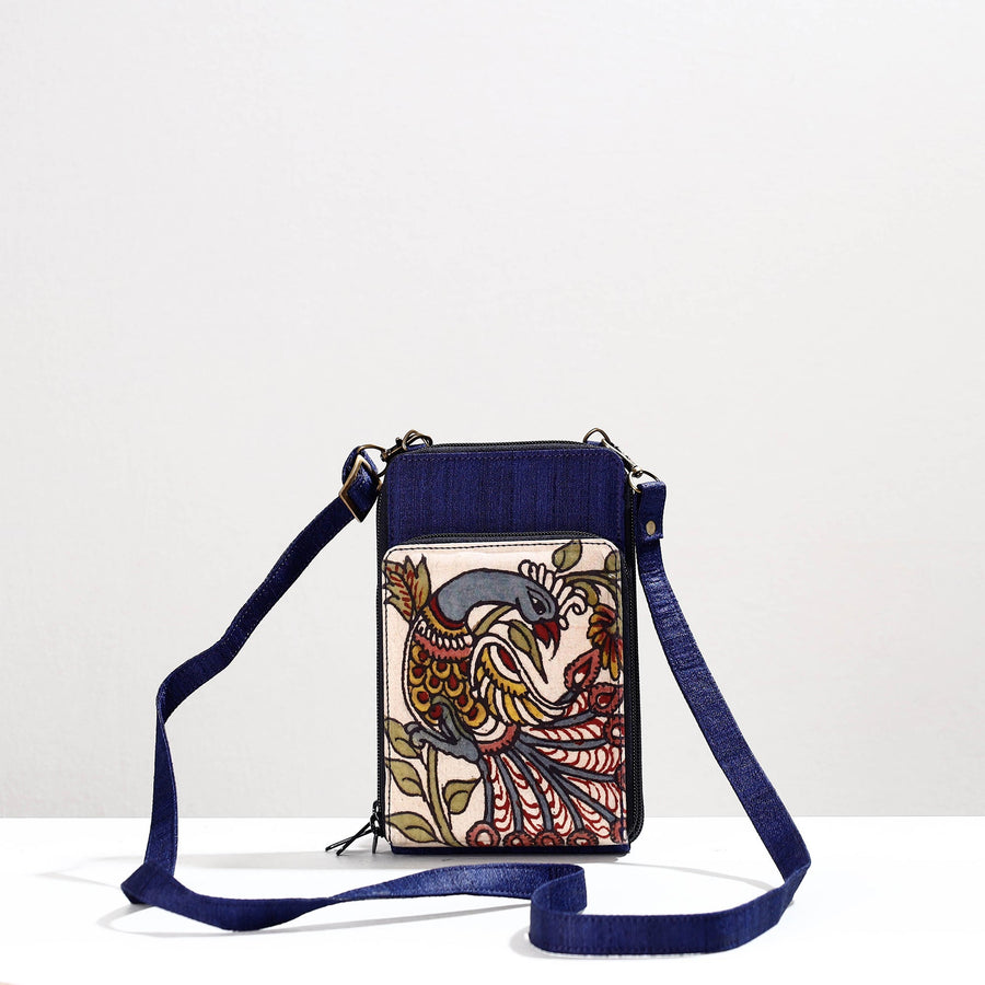 This blue handpainted kalamkari sling bag is crafted from natural dyed cotton and ghicha silk fabric, offering a blend of durability and elegance. The bag features an adjustable and detachable sling for convenience. It offers three zipper sections, each with a separate zipper pocket, and five card slots, providing ample storage and organization options for essentials, cards, and personal items. This exquisite sling bag is created with handpainted kalamkari work, wherein the "Bamboo Kalam’s" is used for free hand drawing of the subject and filling in the colours. It is entirely hand worked using natural colours.