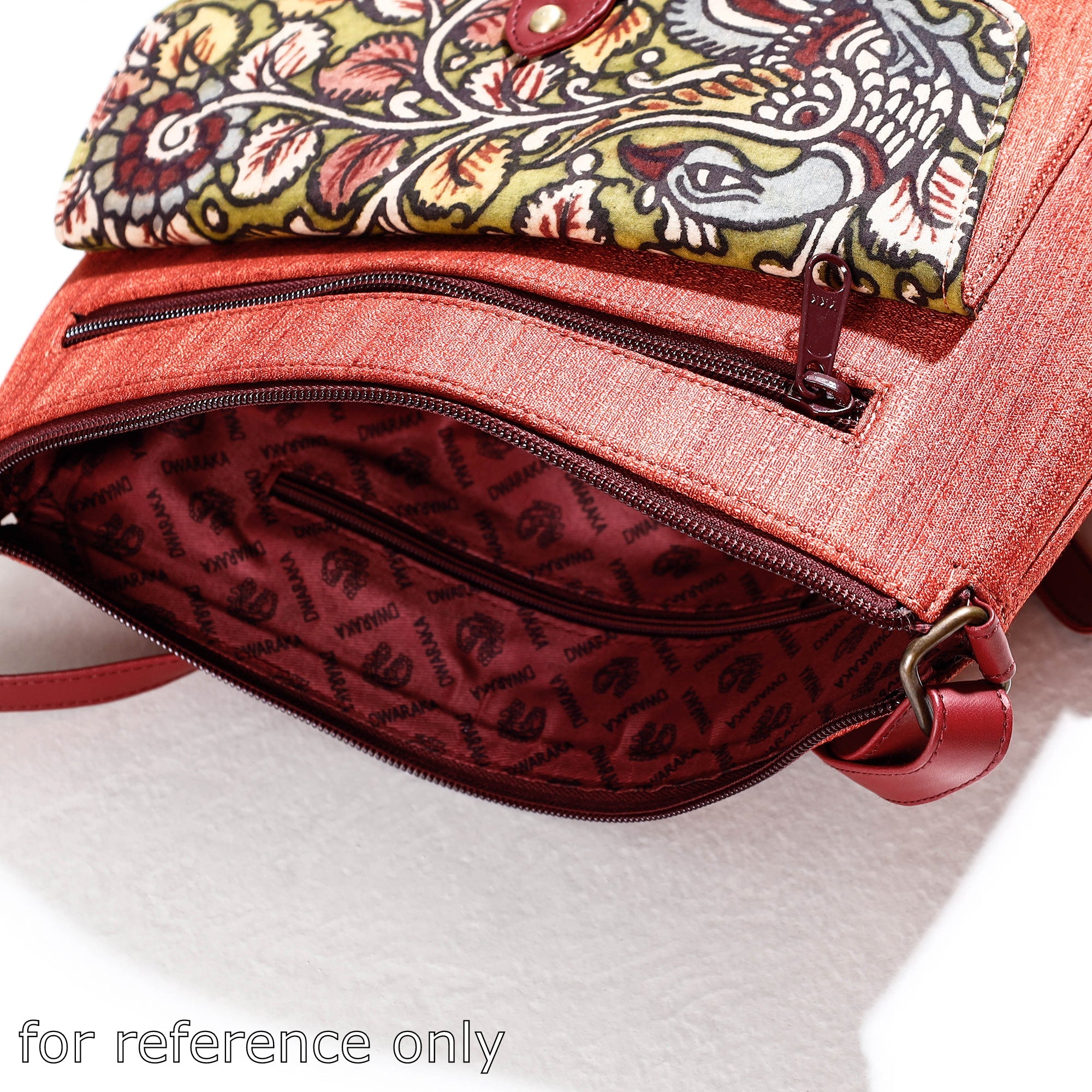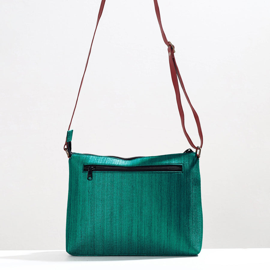 This green handpainted kalamkari sling bag is crafted from natural dyed cotton and ghicha silk fabric, offering a blend of durability and elegance. The bag features an adjustable sling for customizable comfort. It has one zipper and one simple pocket inside, along with two zipper pockets and one magnetic snap button pocket outside for efficient organization of your belongings. This exquisite sling bag is created with handpainted kalamkari work, wherein the "Bamboo Kalam’s" is used for free hand drawing of the subject and filling in the colours. It is entirely hand worked using natural colours.