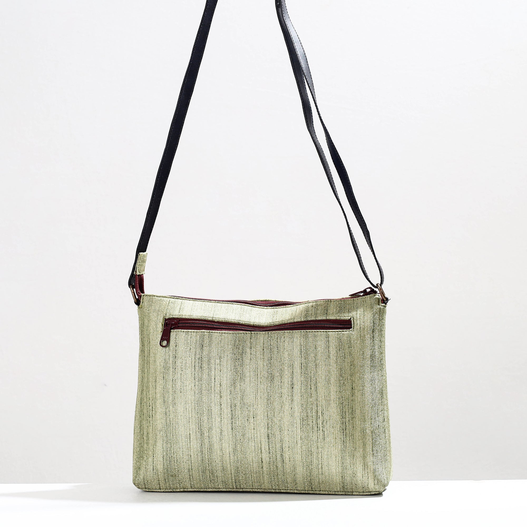 This green handpainted kalamkari sling bag is crafted from natural dyed cotton and ghicha silk fabric, offering a blend of durability and elegance. The bag features an adjustable sling for customizable comfort. It has one zipper and one simple pocket inside, along with two zipper pockets and one magnetic snap button pocket outside for efficient organization of your belongings. This exquisite sling bag is created with handpainted kalamkari work, wherein the "Bamboo Kalam’s" is used for free hand drawing of the subject and filling in the colours. It is entirely hand worked using natural colours.
