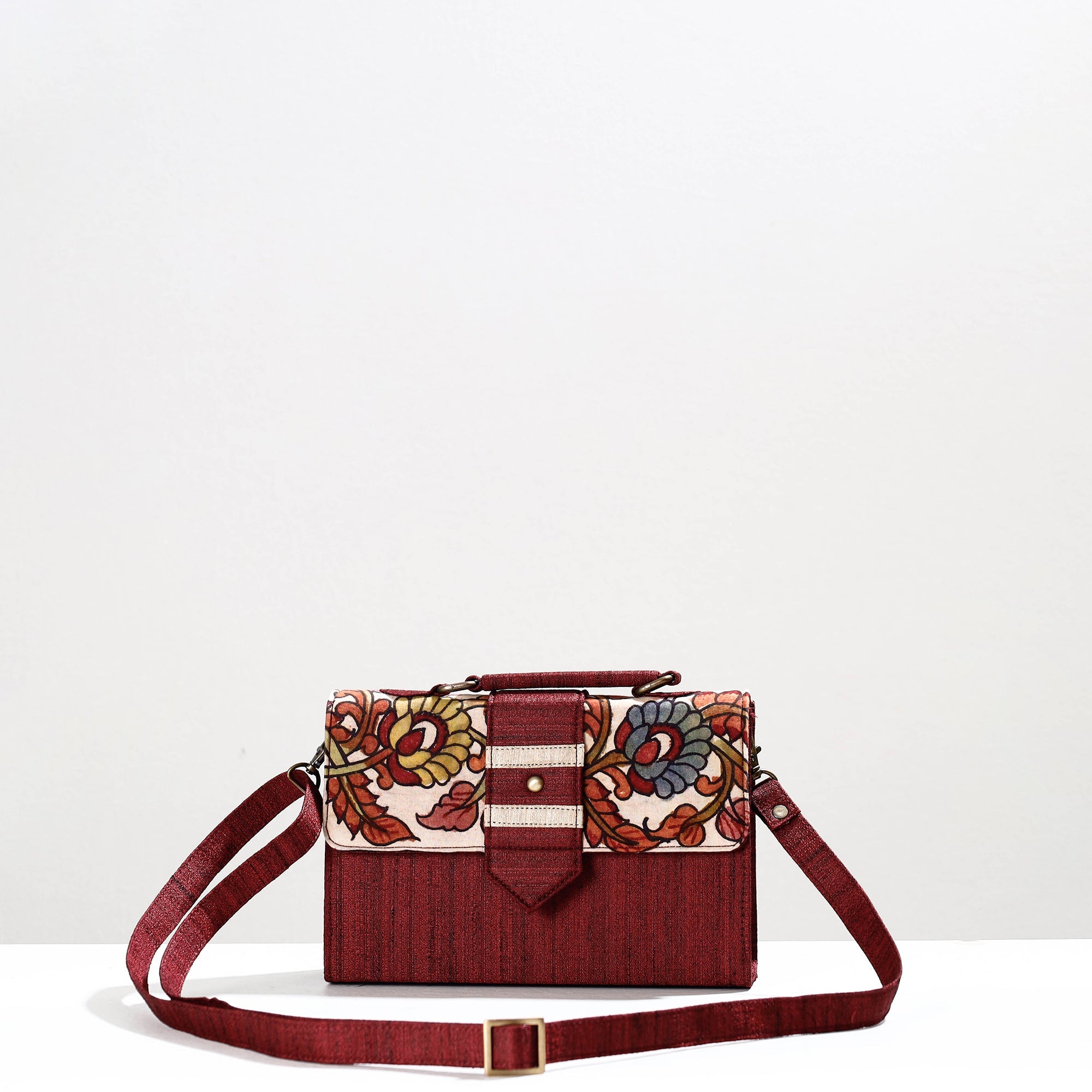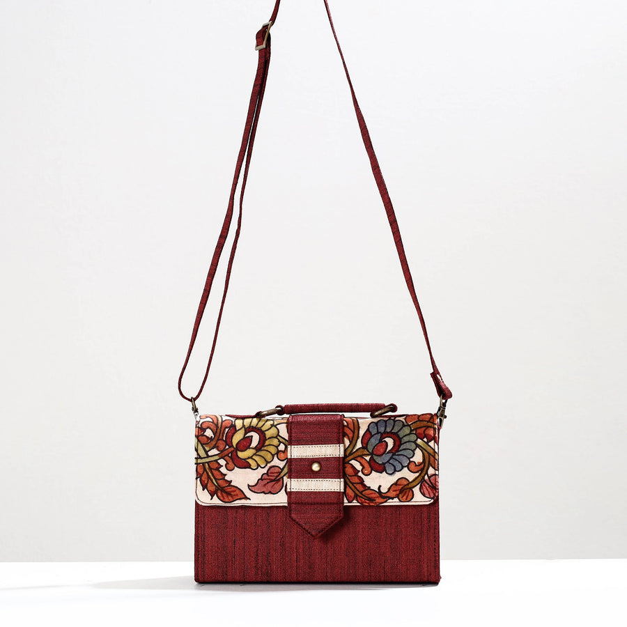 This brown handpainted kalamkari sling bag is crafted from natural dyed cotton and ghicha silk fabric, offering a blend of durability and elegance. The bag features an adjustable and detachable sling for convenience and versatility. It includes one zipper and one simple pocket inside, providing secure storage options. This exquisite sling bag is created with handpainted kalamkari work, wherein the "Bamboo kalam" is used for free hand drawing of the subject and filling in the colours. It is entirely hand worked using natural colours.