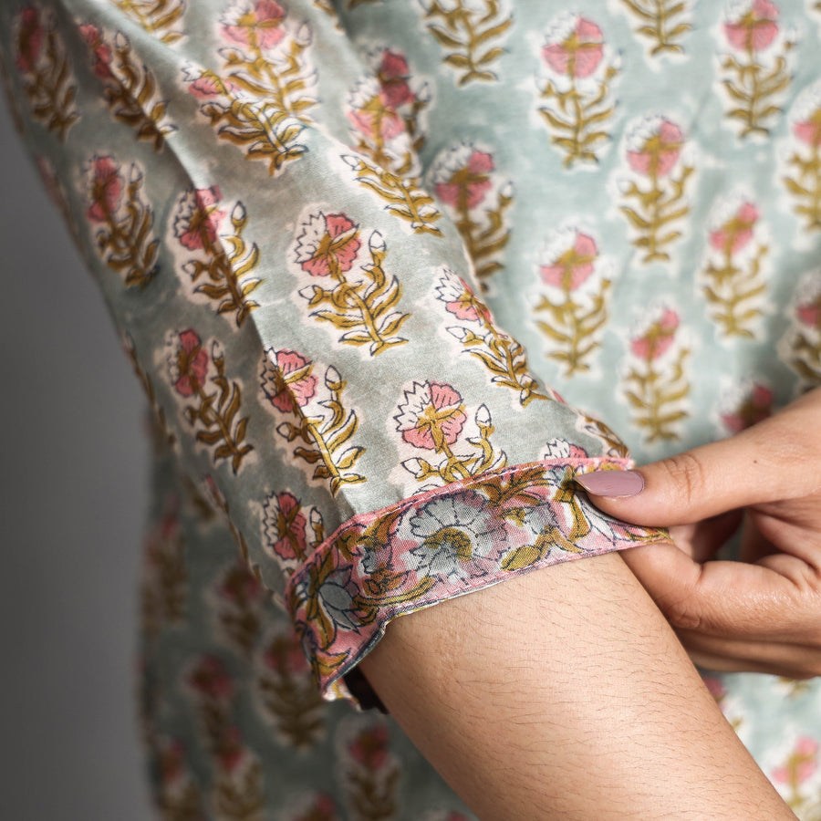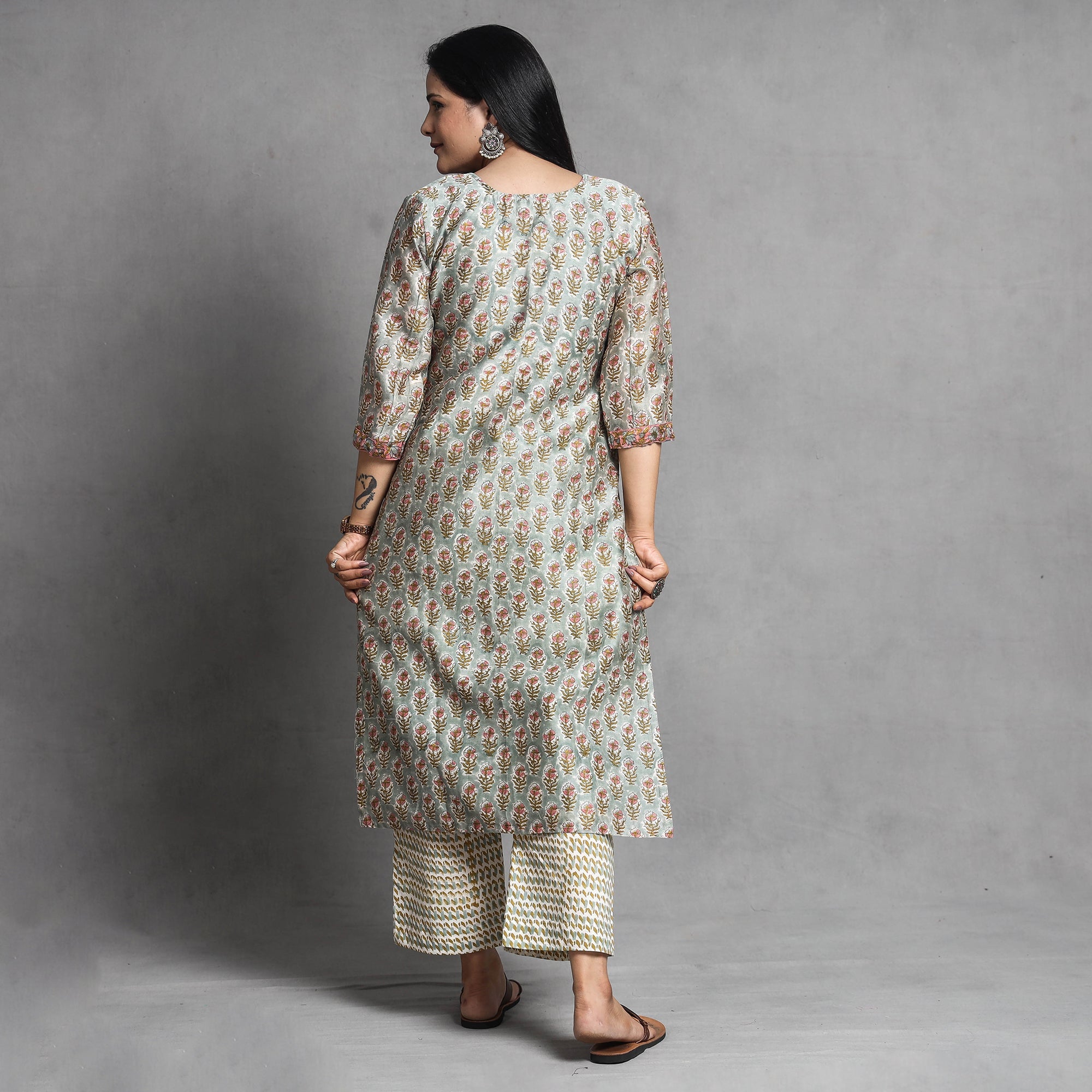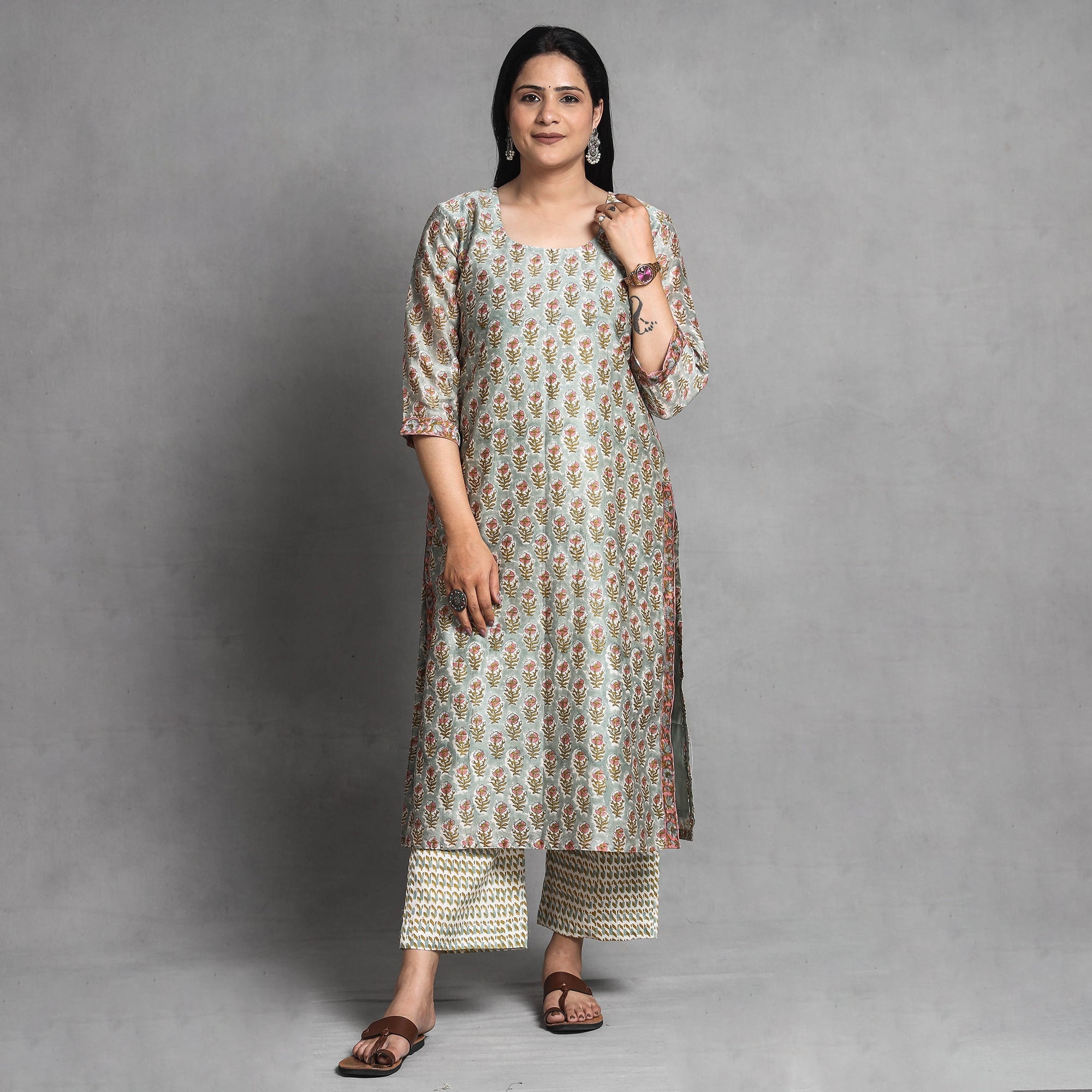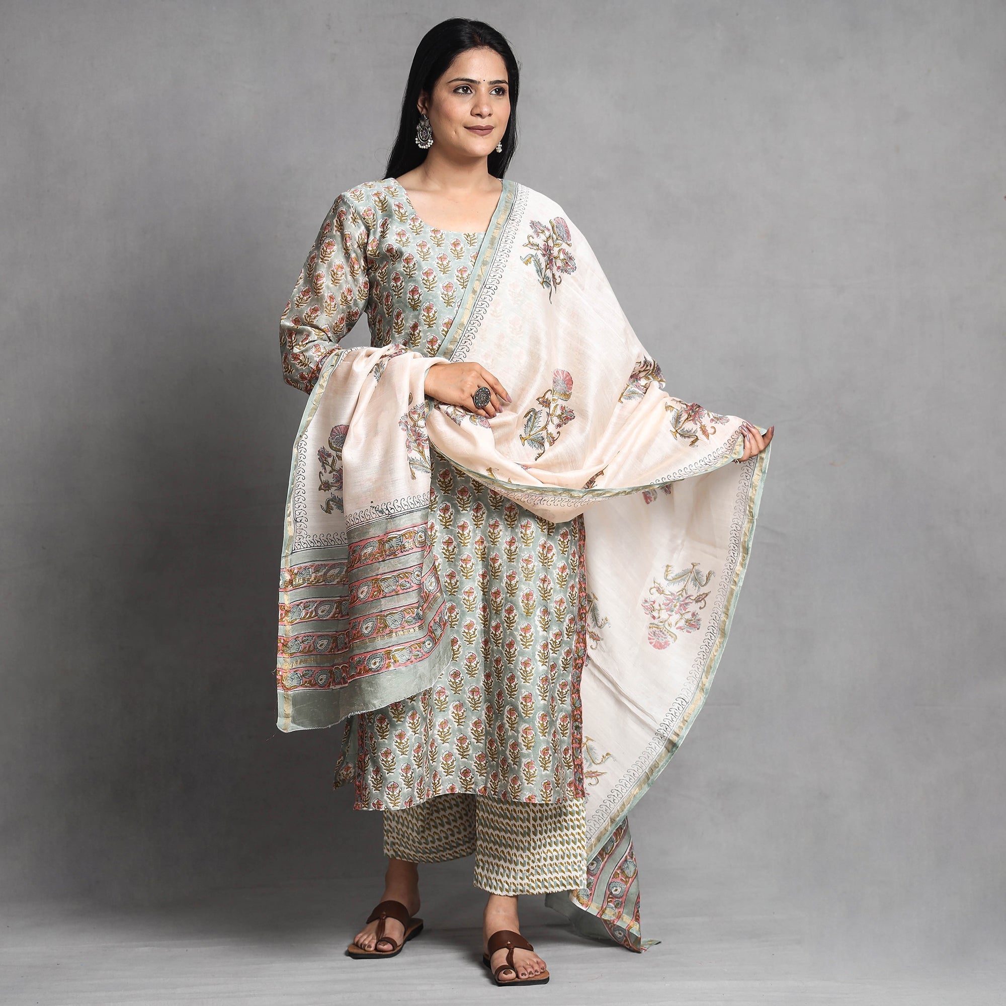 Look and feel beautiful in this uniquely designed sanganeri hand block printed chanderi silk long Kurta with palazzo & dupatta set. This suit set contains a chanderi silk Kurta, dupatta and elasticated cotton palazzo. The Kurta has one side pocket, and the palazzo has two side pockets. This chanderi silk suit makes you comfortable with ease all day long. This suit is perfect for your daily outing and for a special occasion.