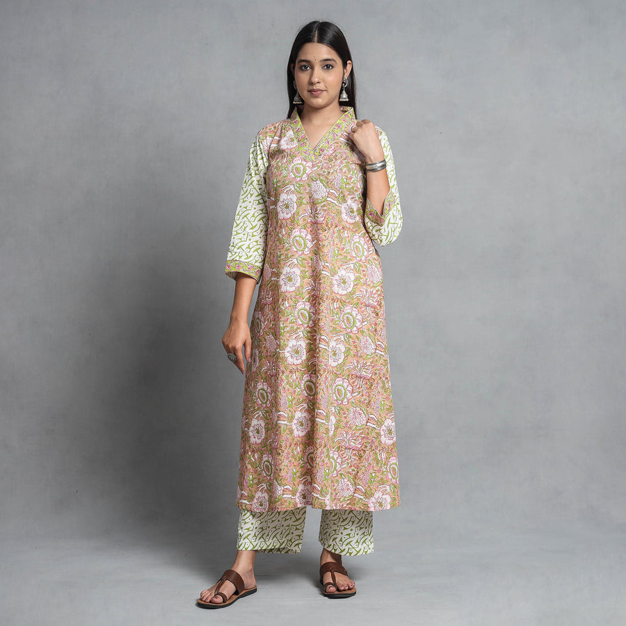 Look and feel beautiful in this uniquely designed sanganeri hand block printed cotton long Kurta with palazzo & dupatta set. This suit set contains a cotton Kurta, palazzo, and mul cotton dupatta. The Kurta has one side pocket, and the palazzo has two side pockets. This cotton suit makes you comfortable with ease all day long. This suit is perfect for your daily outing and for a special occasion.