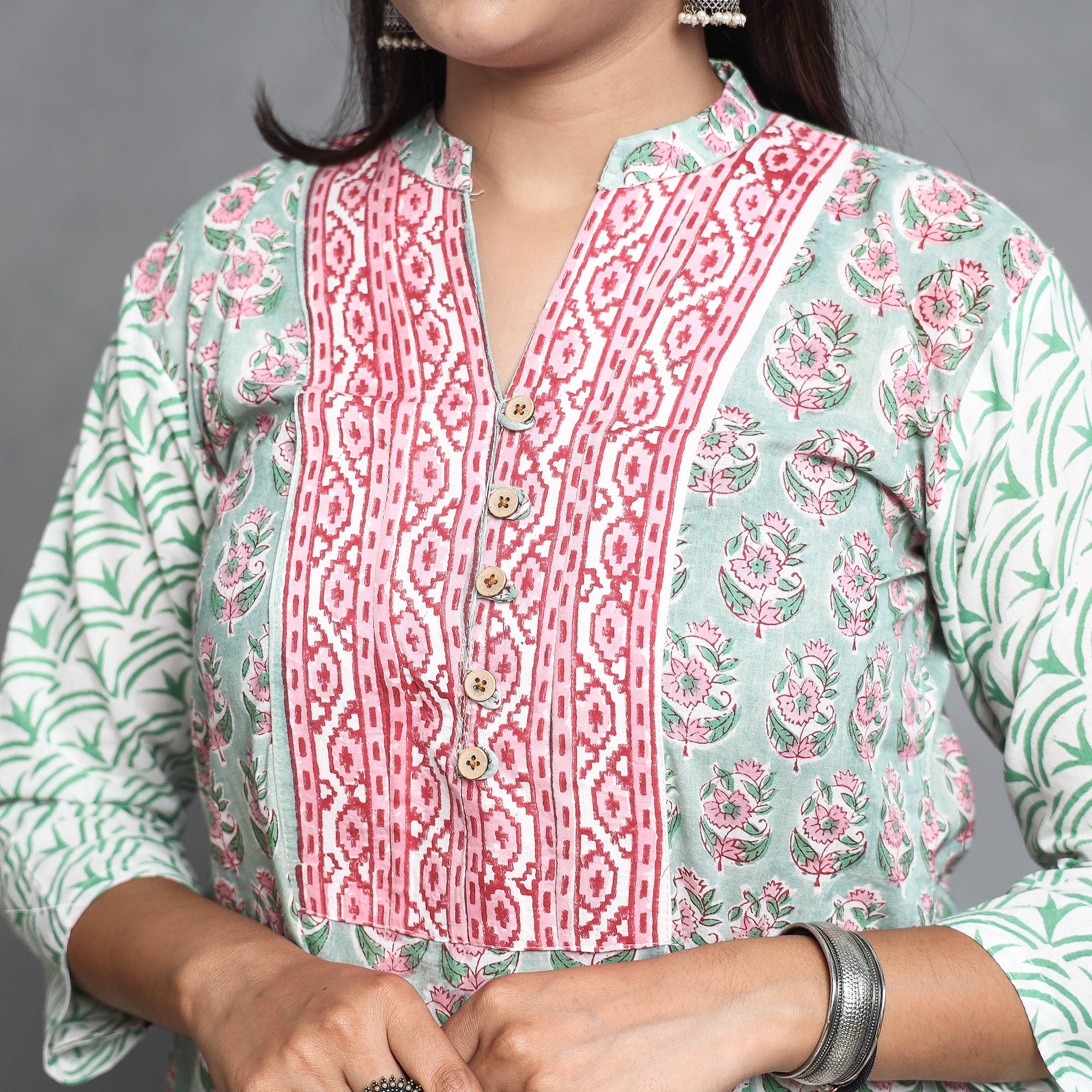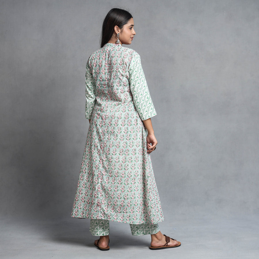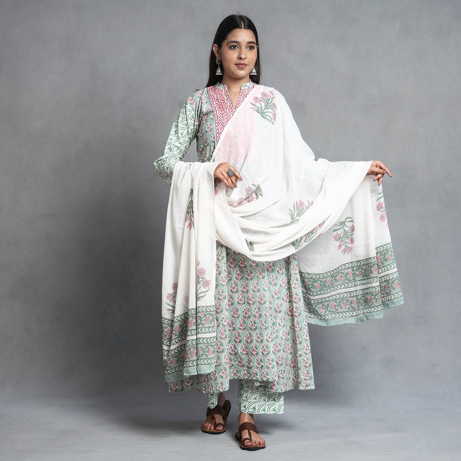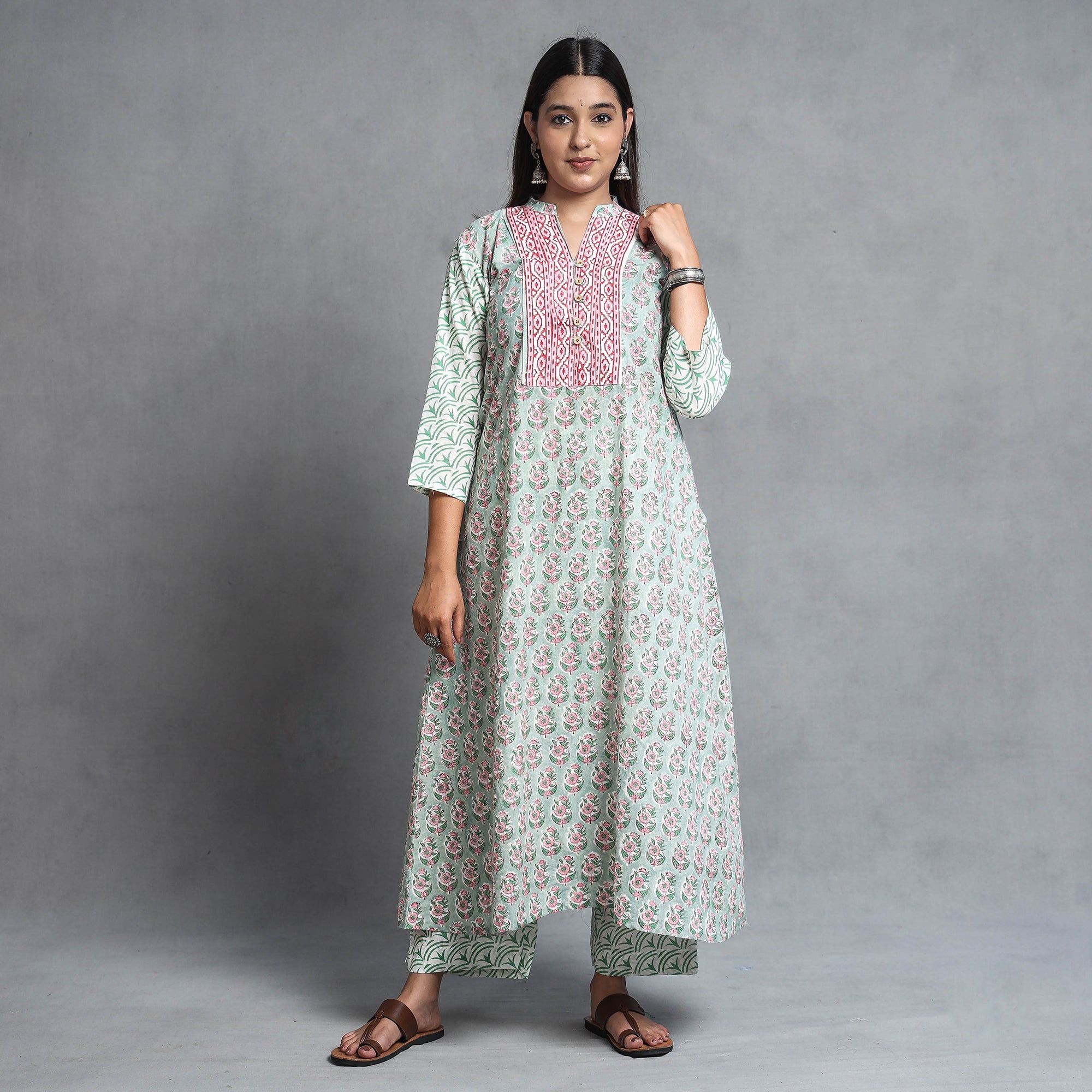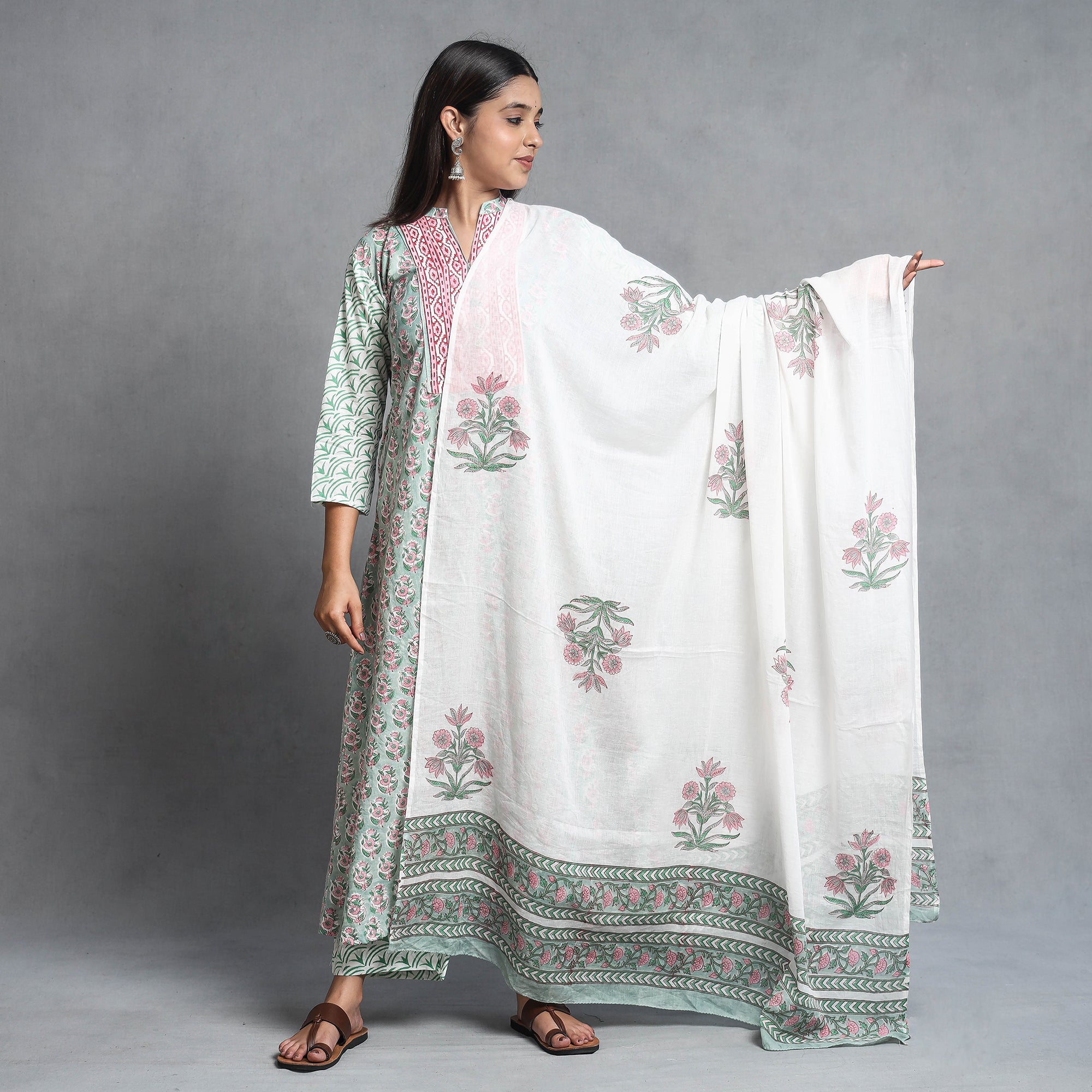 Look and feel beautiful in this uniquely designed sanganeri hand block printed cotton long kurta with palazzo & dupatta set. This suit set contains a cotton kurta, palazzo, and mul cotton dupatta. The kurta has one side pocket, and the palazzo has two side pockets. This cotton suit makes you comfortable with ease all day long. This suit is perfect for your daily outing and for a special occasion.