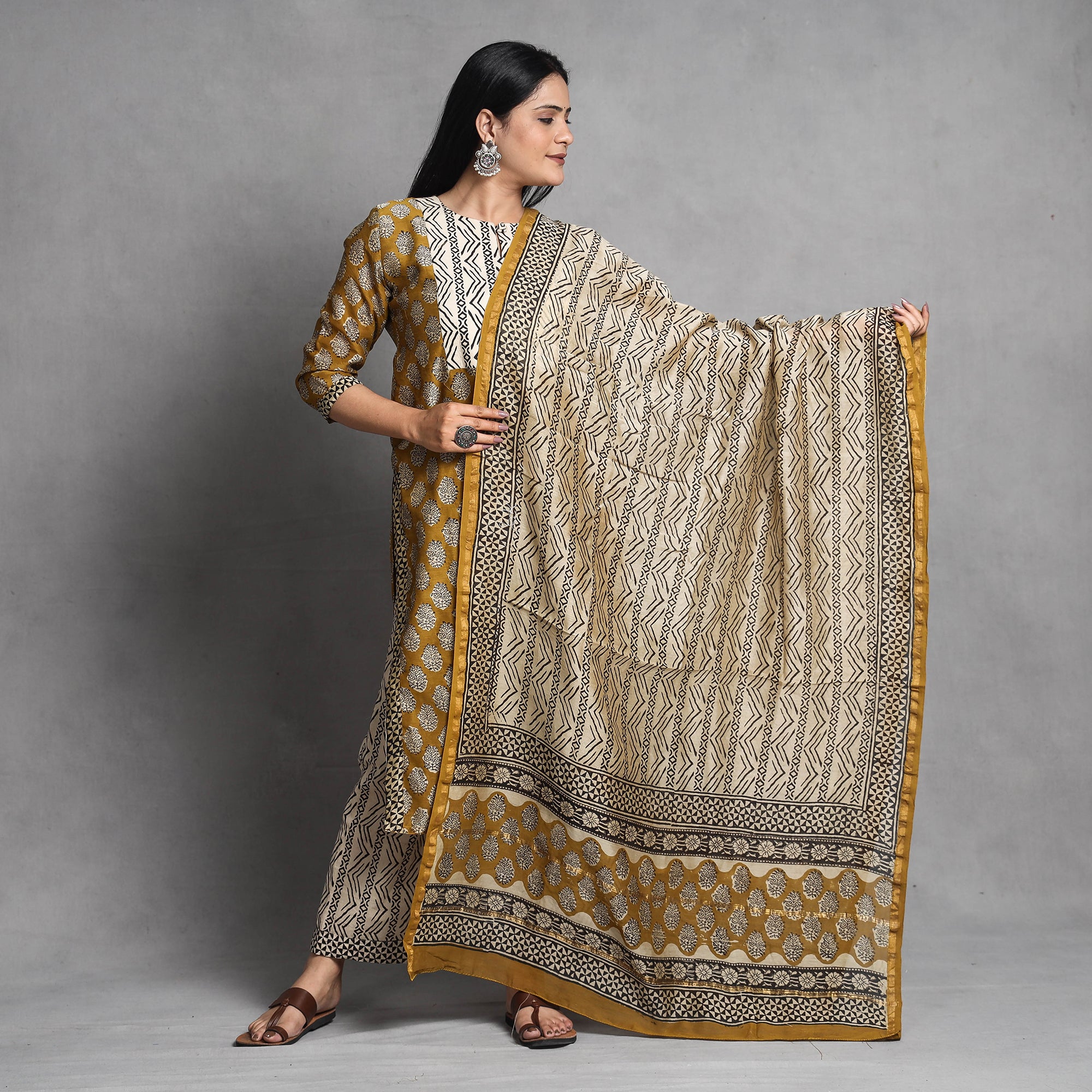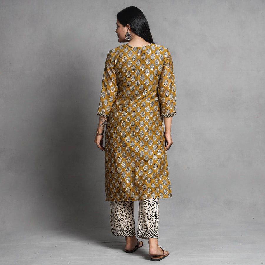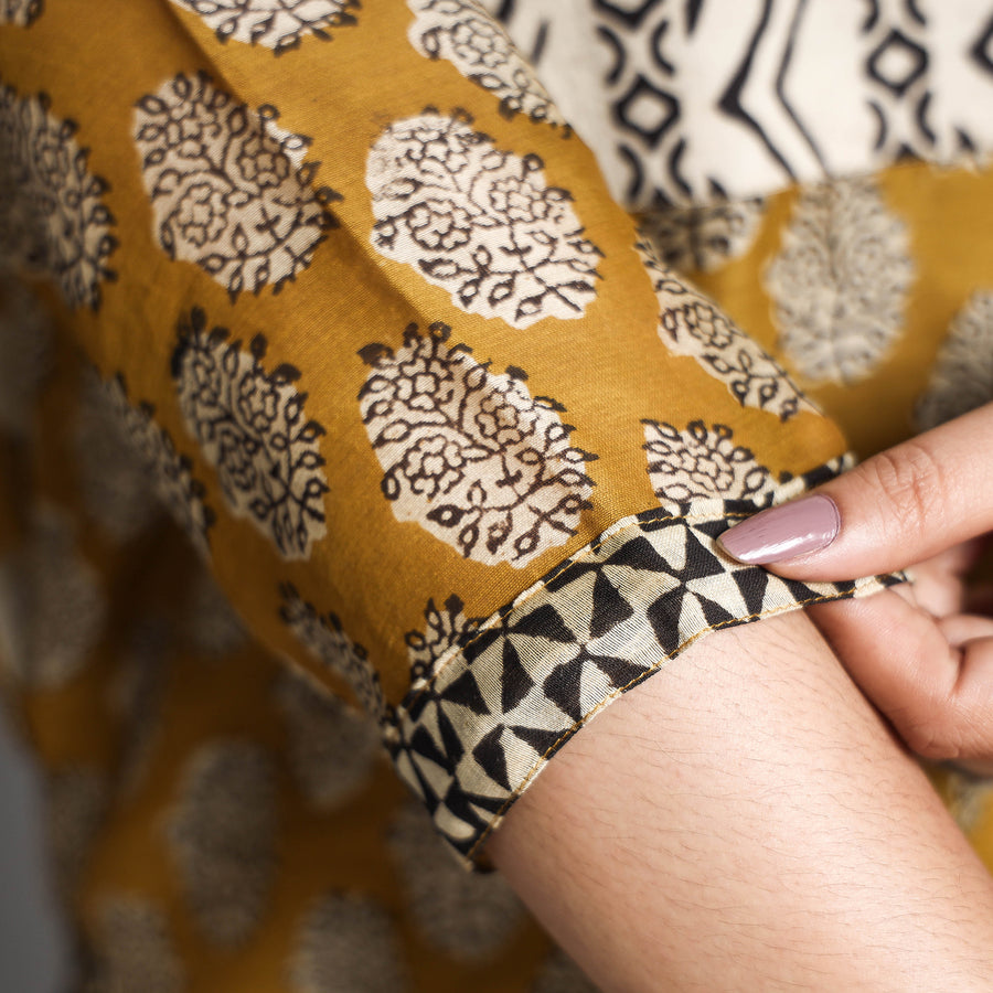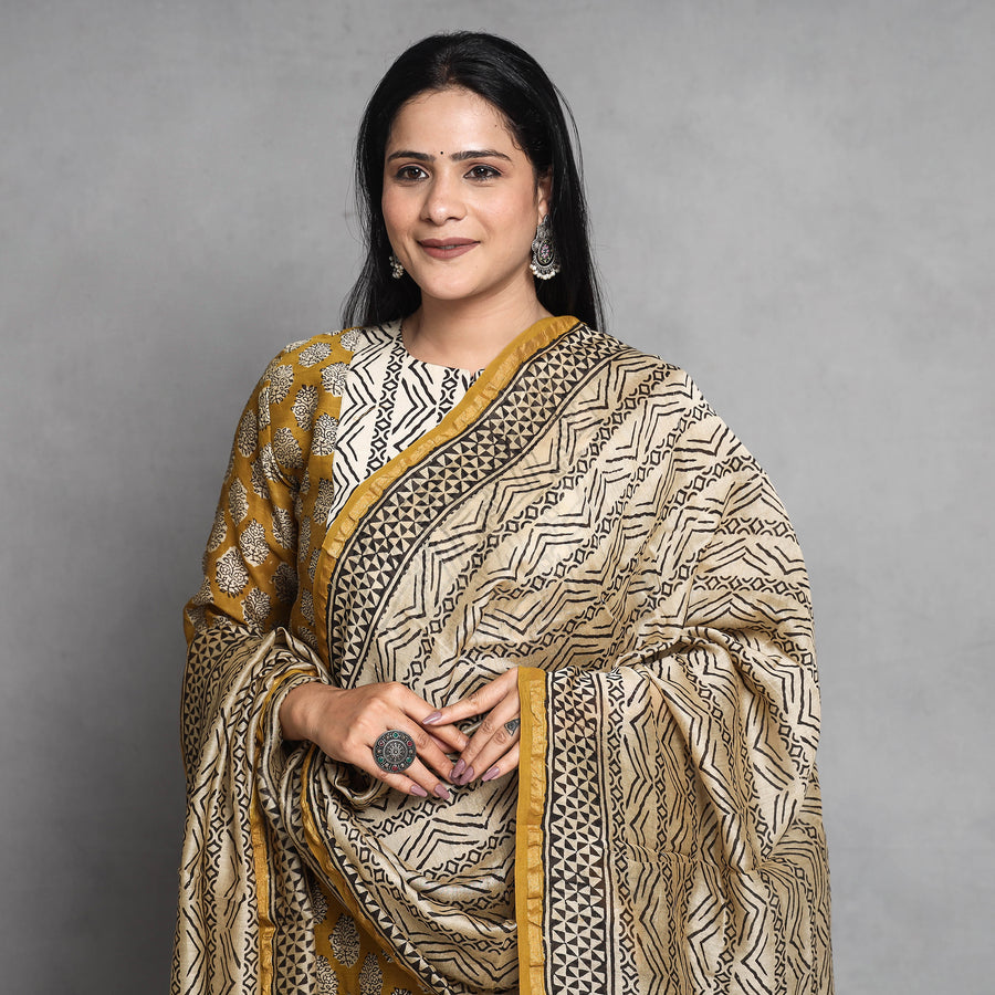 Look and feel beautiful in this uniquely designed yellow bagru hand block printed chanderi silk long Kurta with palazzo & dupatta set. This suit set contains a chanderi silk Kurta, dupatta and elasticated cotton palazzo. The Kurta has one side pocket, and the palazzo has two side pockets. This chanderi silk suit makes you comfortable with ease all day long. This suit is perfect for your daily outing and for a special occasion.