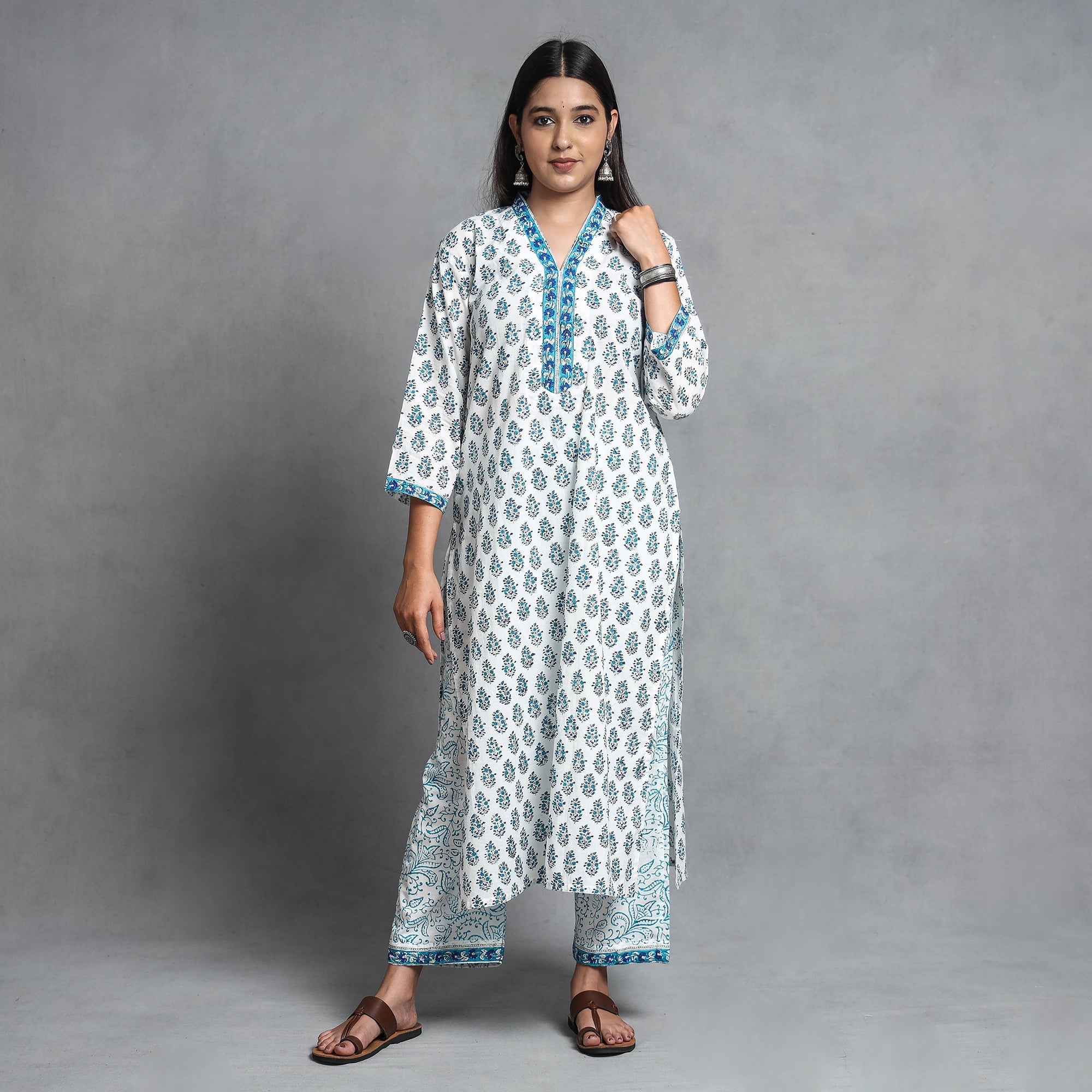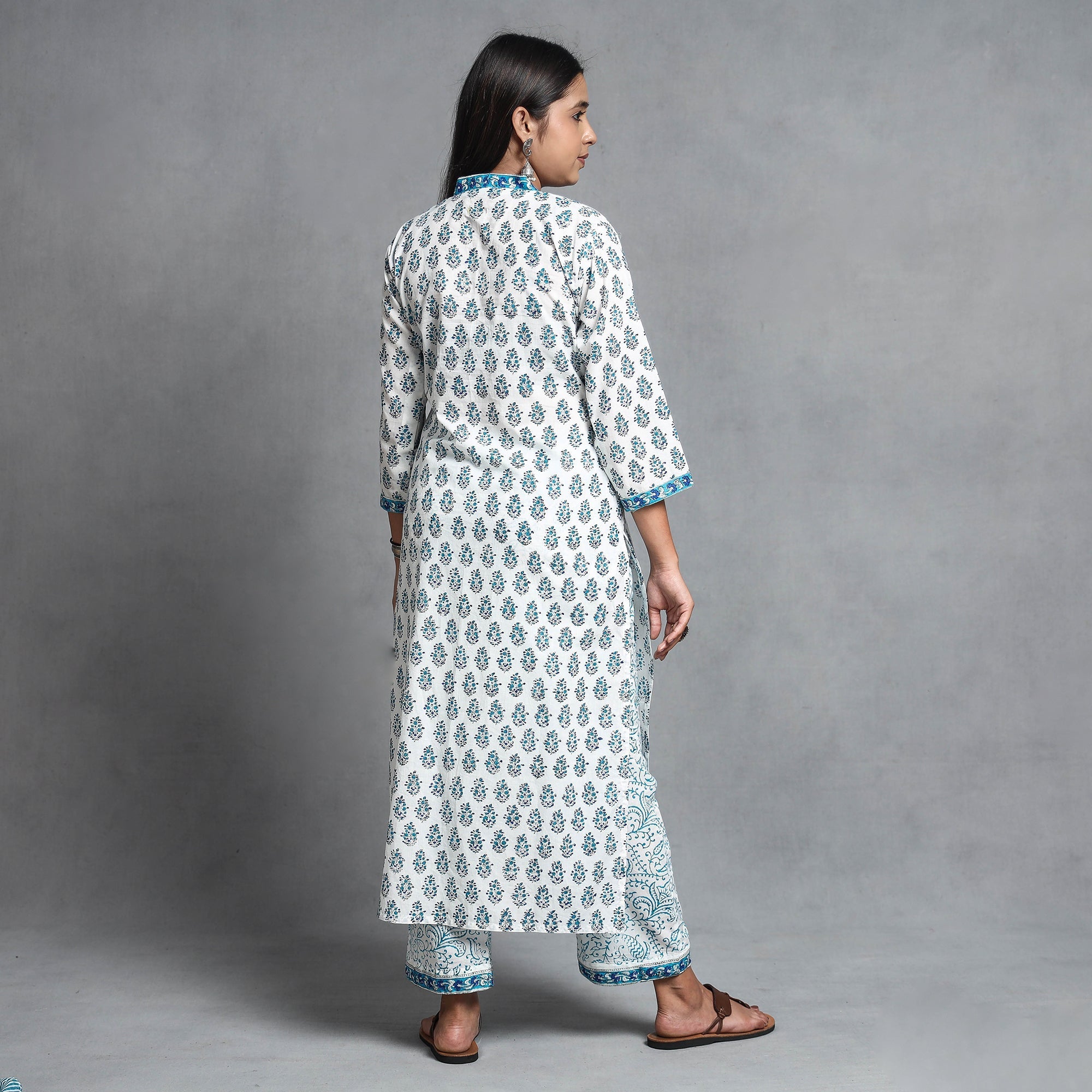 Look and feel beautiful in this uniquely designed sanganeri hand block printed cotton long kurta with palazzo & dupatta set. This suit set contains a cotton kurta, palazzo, and mul cotton dupatta. The kurta has one side pocket, and the palazzo has two side pockets. This cotton suit makes you comfortable with ease all day long. This suit is perfect for your daily outing and for a special occasion.