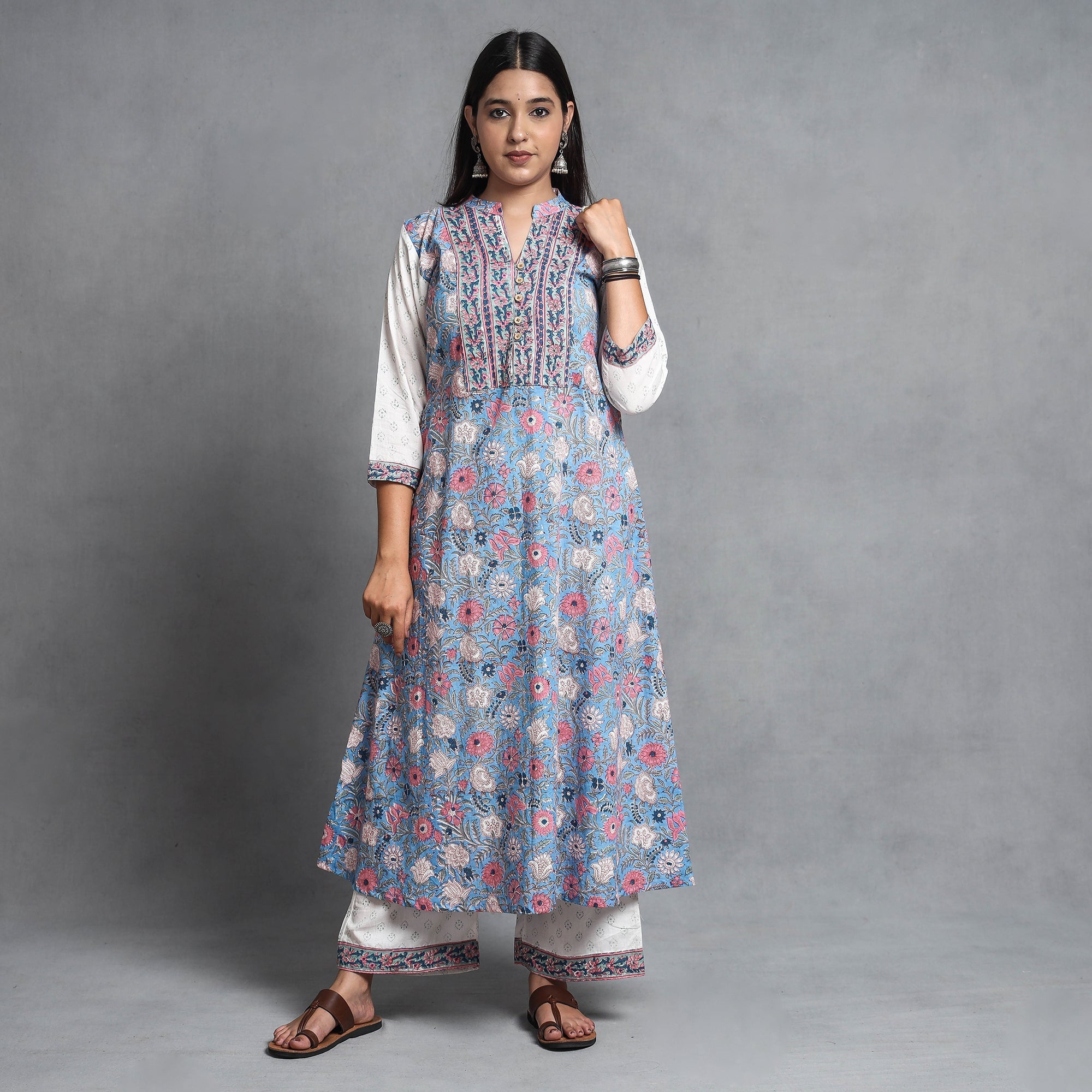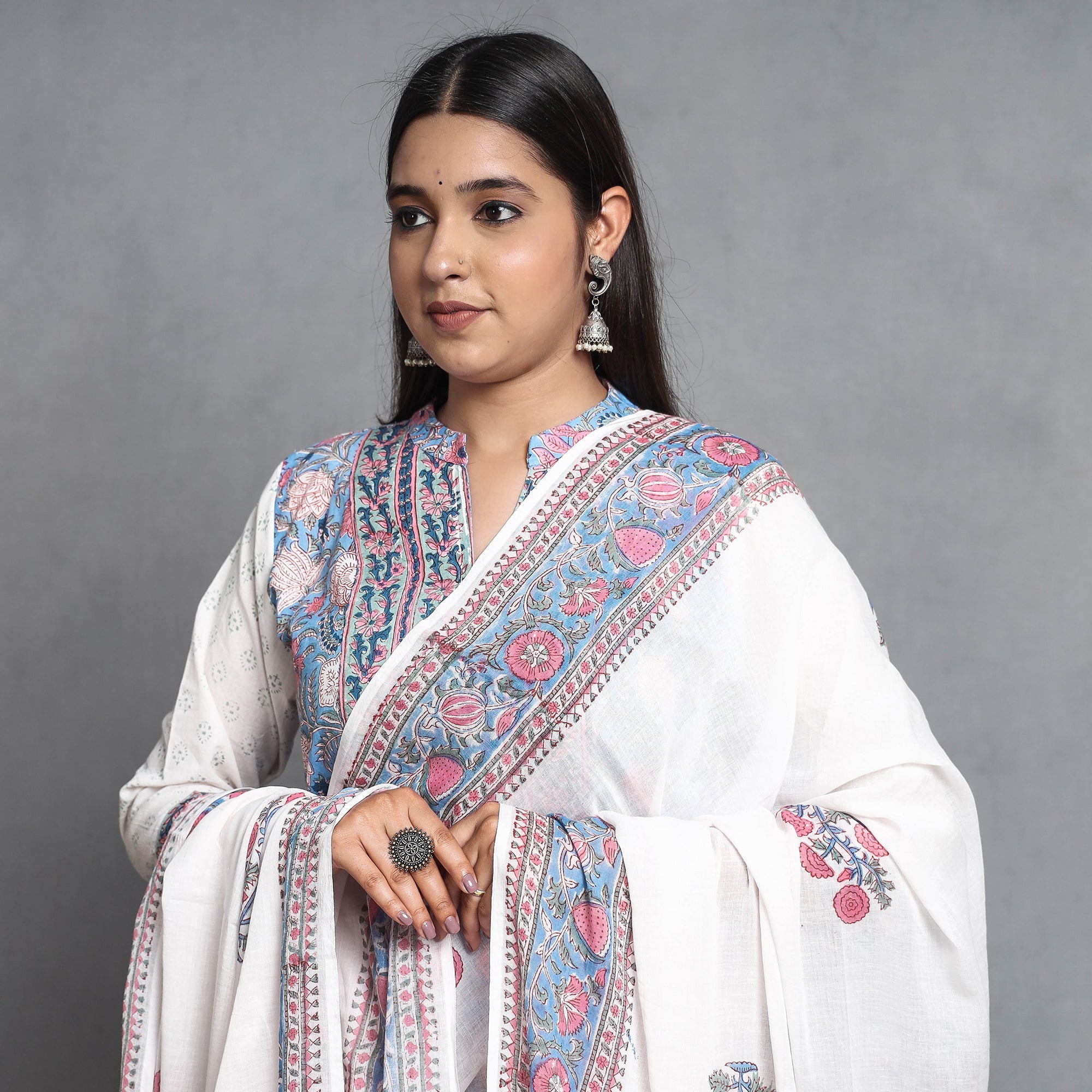 Look and feel beautiful in this uniquely designed sanganeri hand block printed cotton long kurta with palazzo & dupatta set. This suit set contains a cotton kurta, palazzo, and mul cotton dupatta. The kurta has one side pocket, and the palazzo has two side pockets. This cotton suit makes you comfortable with ease all day long. This suit is perfect for your daily outing and for a special occasion.