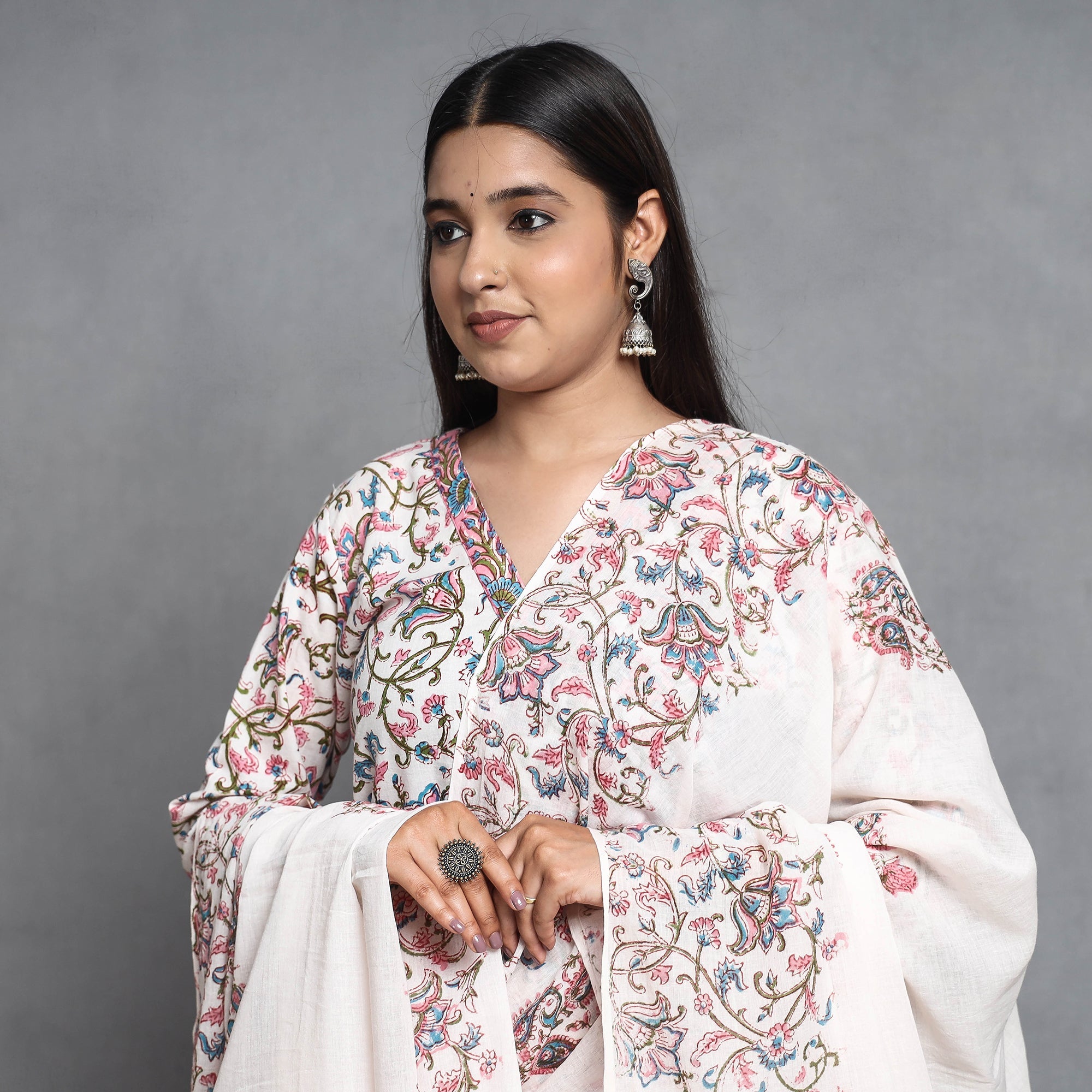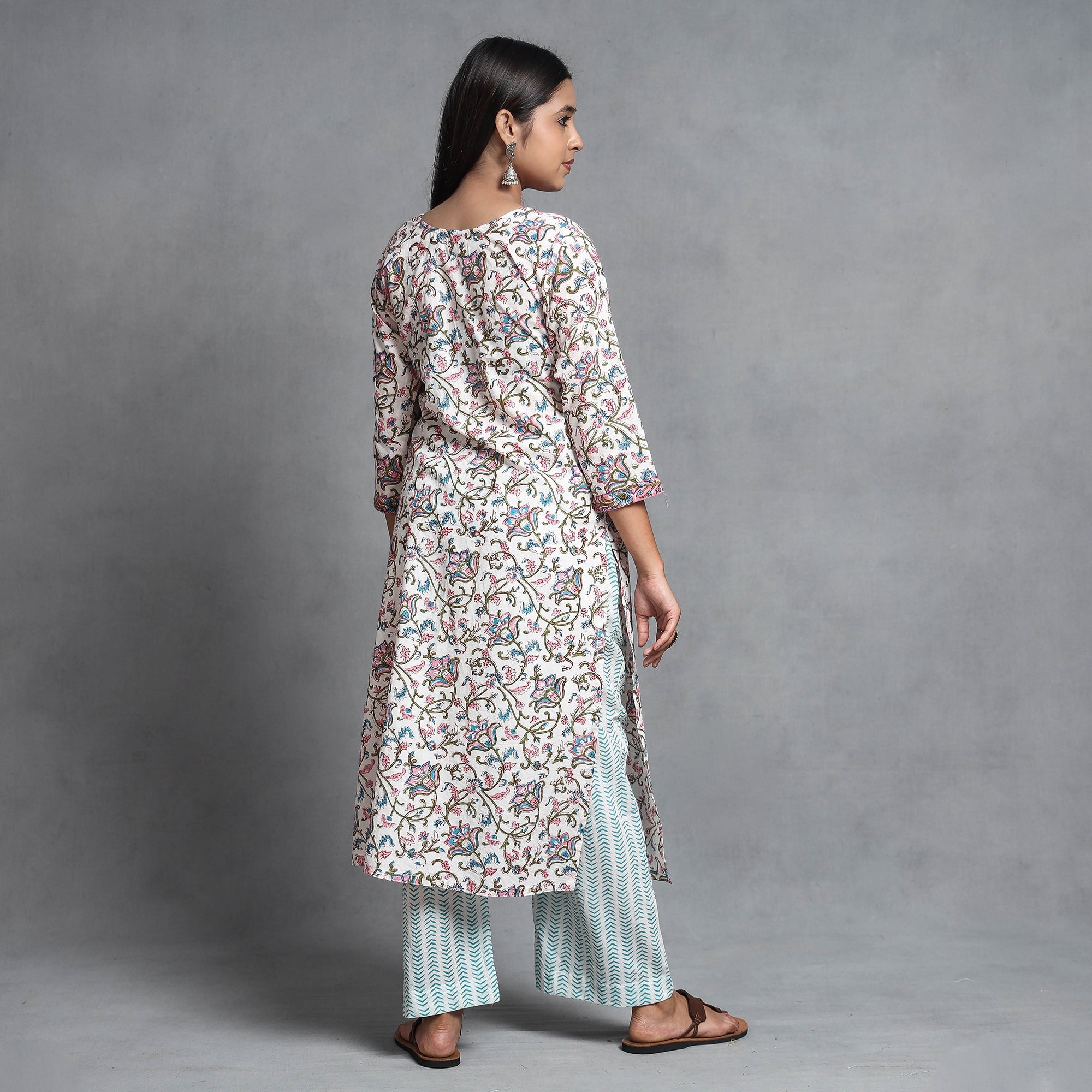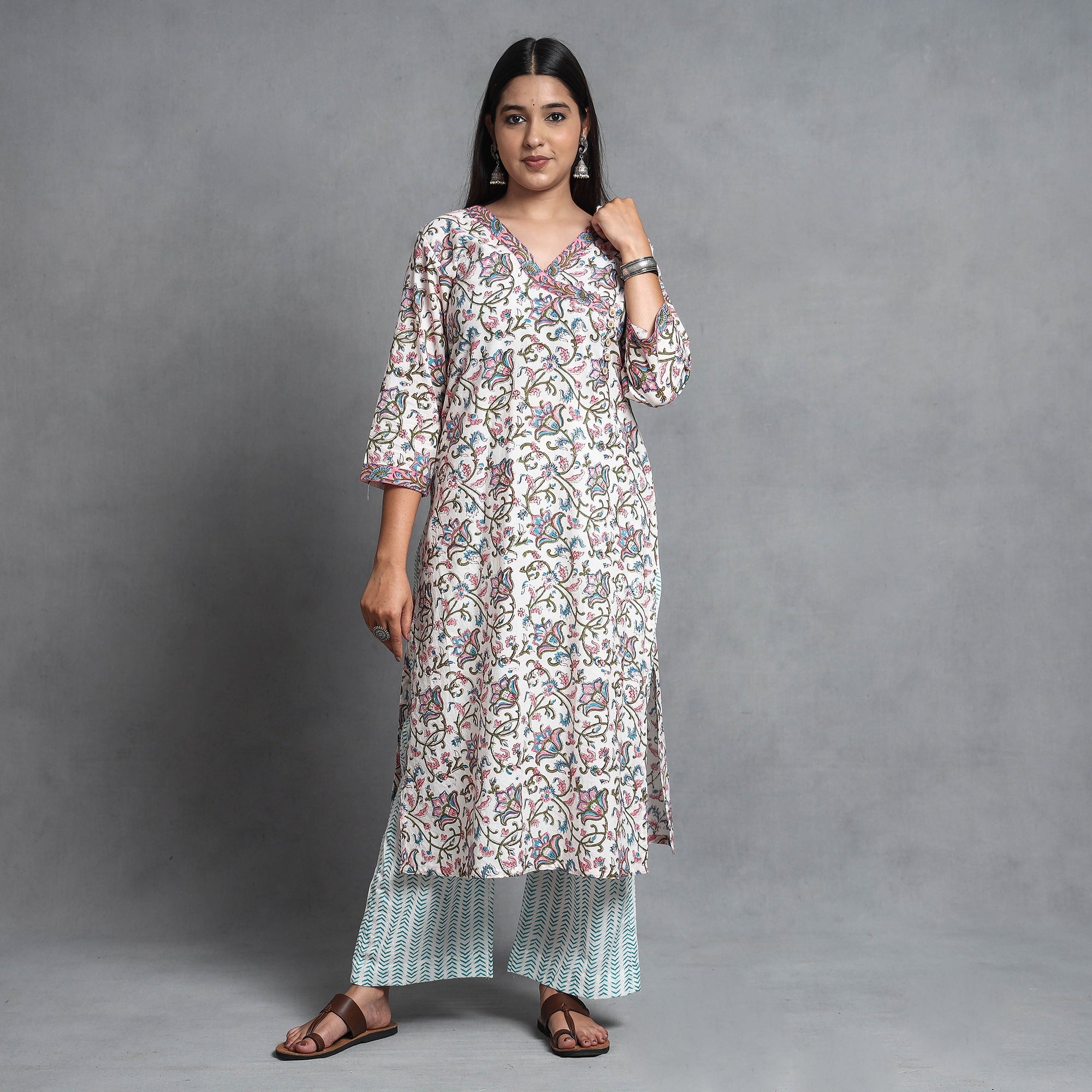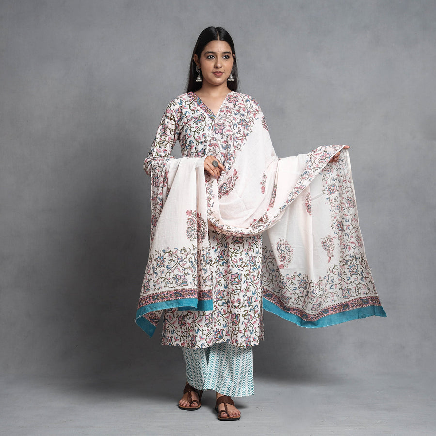 Look and feel beautiful in this uniquely designed sanganeri hand block printed cotton long Kurta with palazzo & dupatta set. This suit set contains a cotton Kurta, palazzo, and mul cotton dupatta. The Kurta has one side pocket, and the palazzo has two side pockets. This cotton suit makes you comfortable with ease all day long. This suit is perfect for your daily outing and for a special occasion.