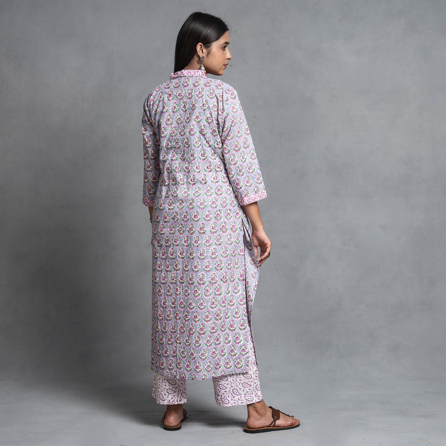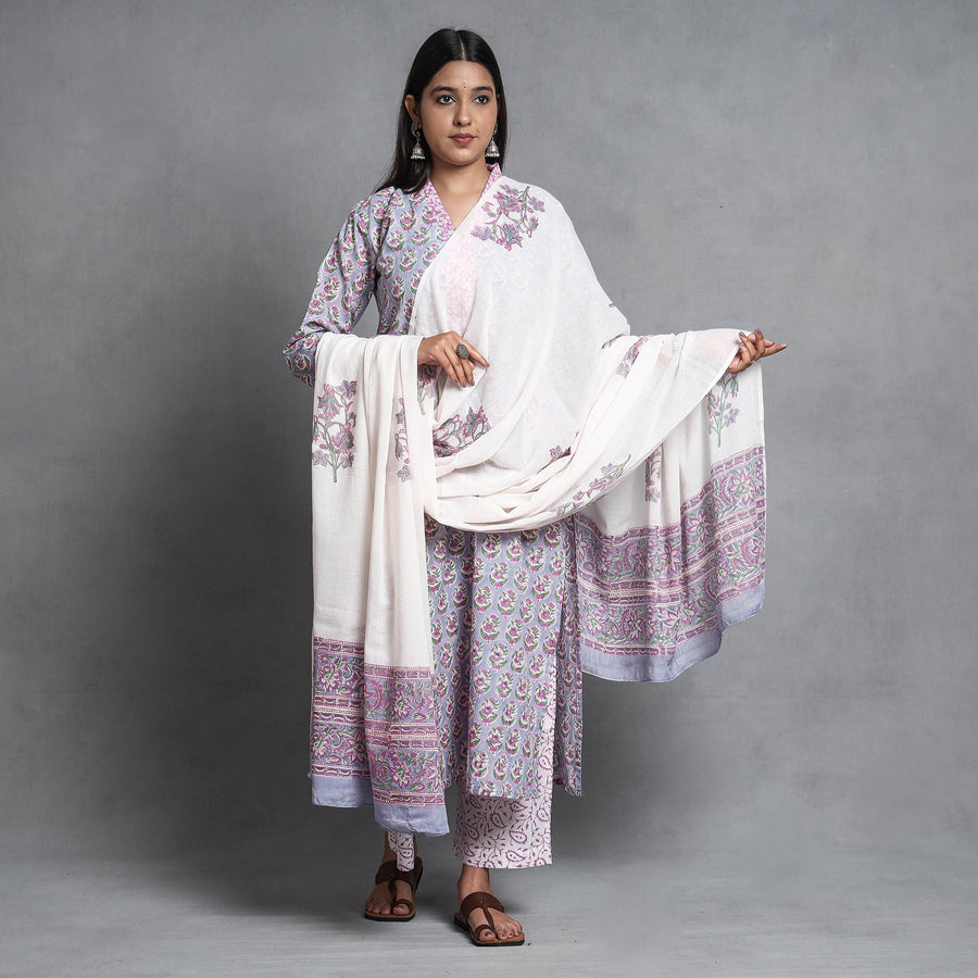 Look and feel beautiful in this uniquely designed sanganeri hand block printed cotton long Kurta with palazzo & dupatta set. This suit set contains a cotton Kurta,, palazzo, and mul cotton dupatta. The Kurta has one side pocket, and the palazzo has two side pockets. This cotton suit makes you comfortable with ease all day long. This suit is perfect for your daily outing and for a special occasion.