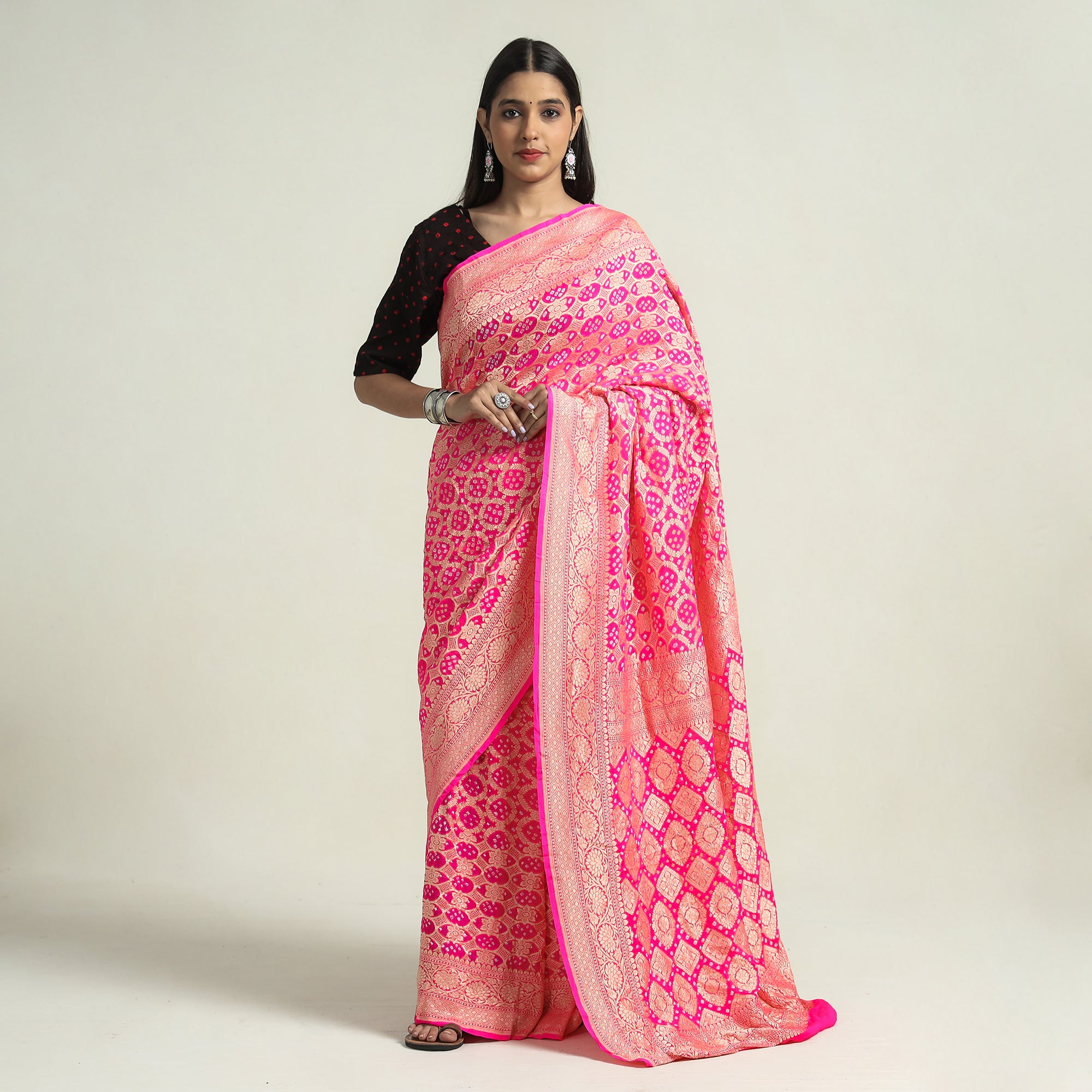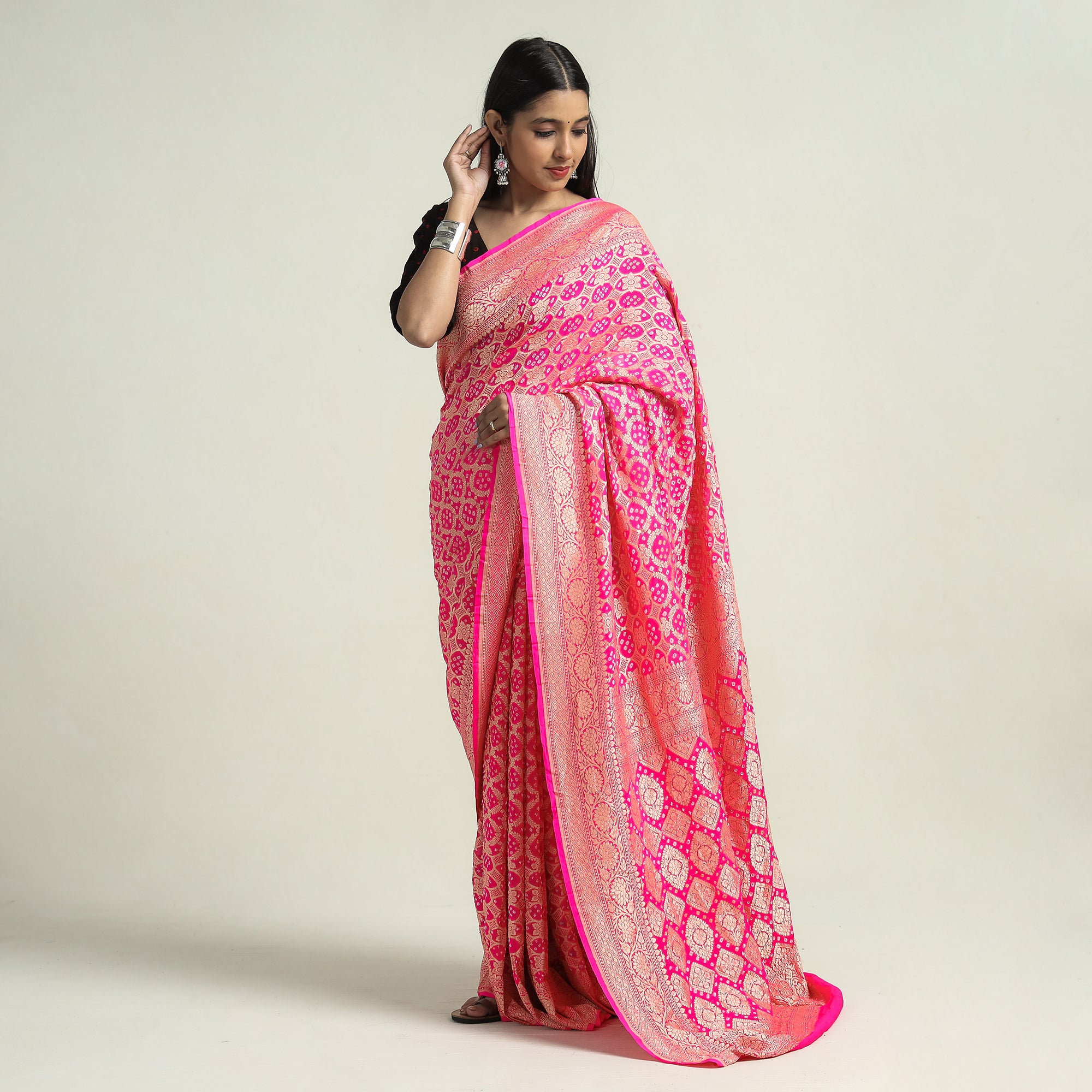 Fine quality pink khaddi pure georgette bandhani banarasi neem zari jaal work saree featuring majestic bandhani pattern, tie-dyed using the traditional technique practised by the artisans of Kutch. This saree has a beautiful gold zari floral jaal all over across the body with a gold zari self border and pallu. The art of Bandhani (Bandhej) is highly skilled process. The technique involves dyeing a fabric which is tied tightly with a thread at several points. The georgette saree is weaved by master artisans of Banaras with zari work & Bandhani work is done by Kutch master artisans.