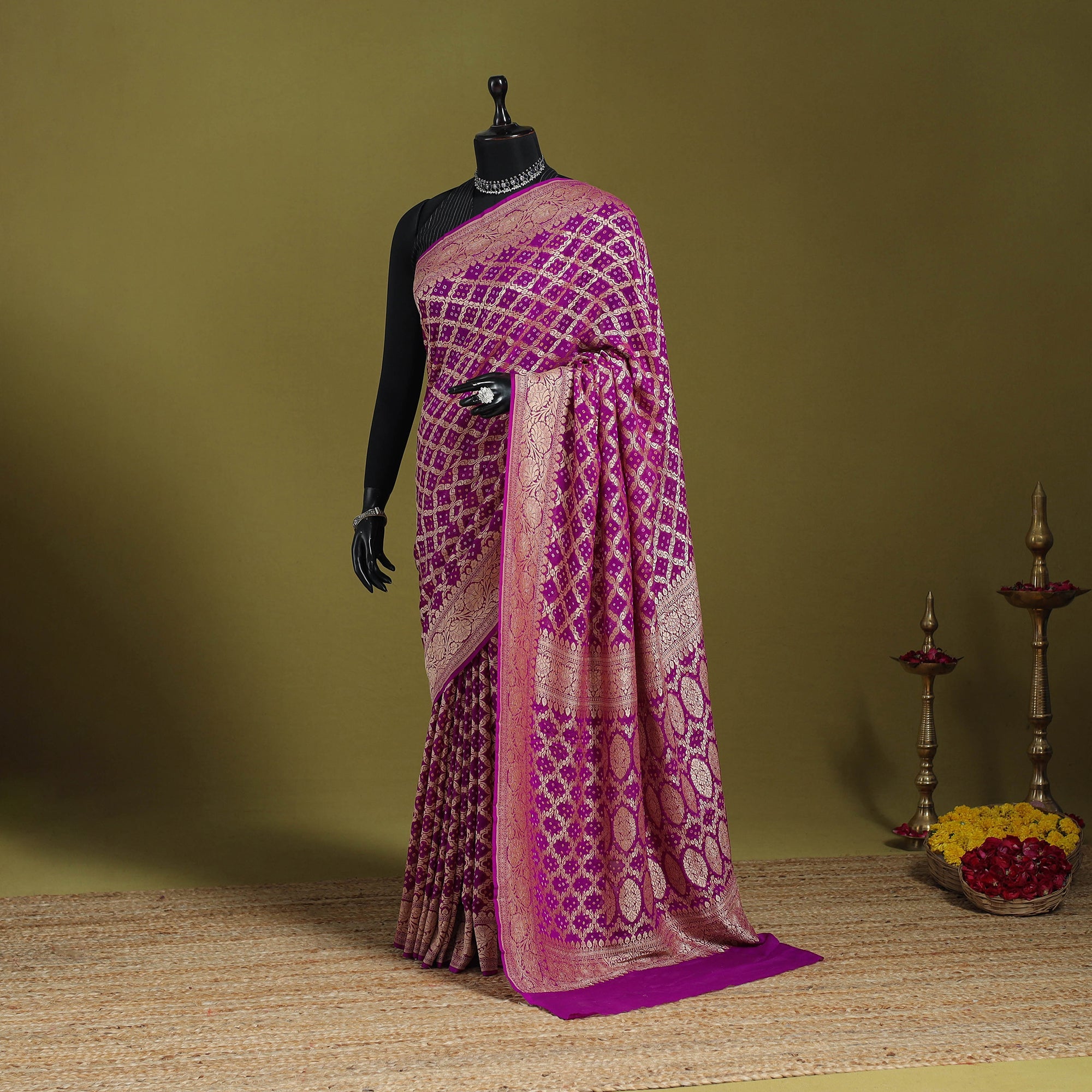 Fine quality purple khaddi pure georgette bandhani banarasi neem zari jaal work saree featuring majestic bandhani pattern, tie-dyed using the traditional technique practised by the artisans of Kutch. This saree has a beautiful gold zari floral jaal all over across the body with a gold zari self border and pallu. The art of Bandhani (Bandhej) is highly skilled process. The technique involves dyeing a fabric which is tied tightly with a thread at several points. The georgette saree is weaved by master artisans of Banaras with zari work & Bandhani work is done by Kutch master artisans.