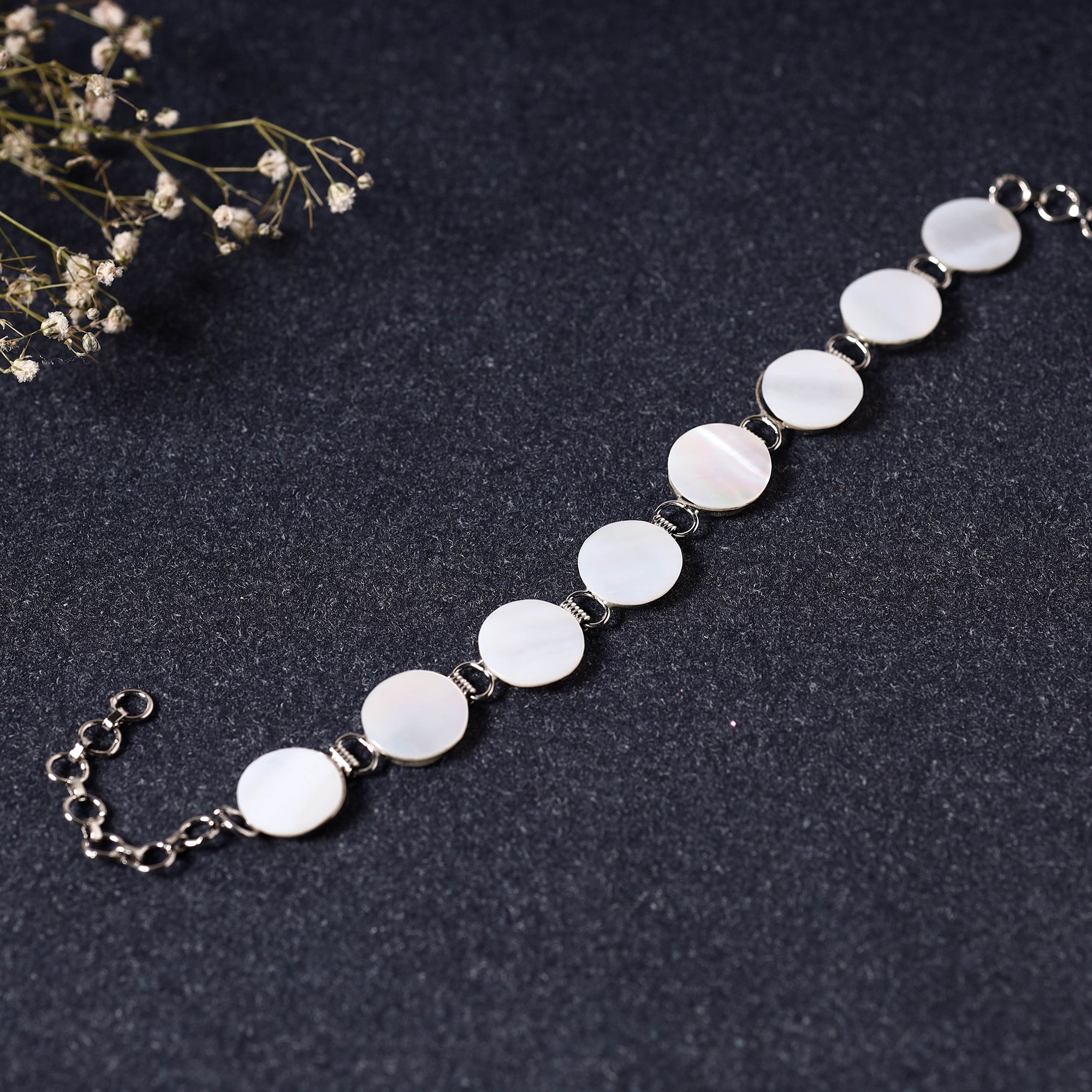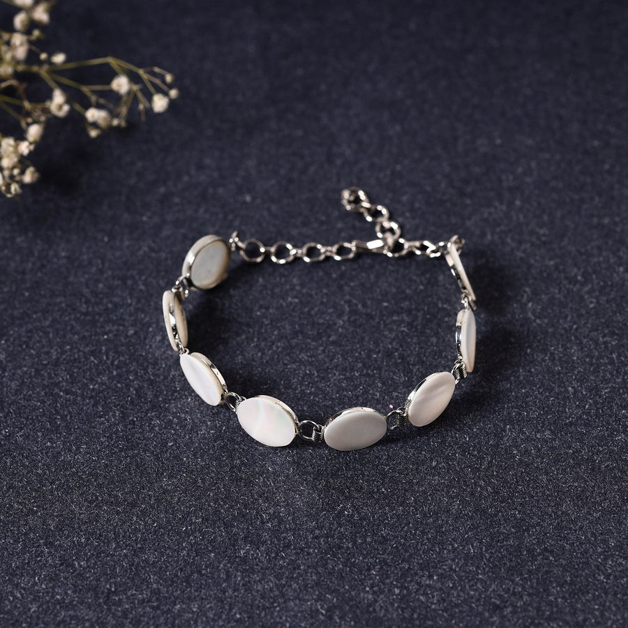 | Material | Handcrafted natural seashell bracelet. Made from steel and natural mother of pearl shells, this stunning accessory adds a touch of natural beauty to any outfit. Versatile and elegant, it's the perfect choice for every occasion. Adorn your wrist with our exquisitely handcrafted seashell stretch bracelet. |