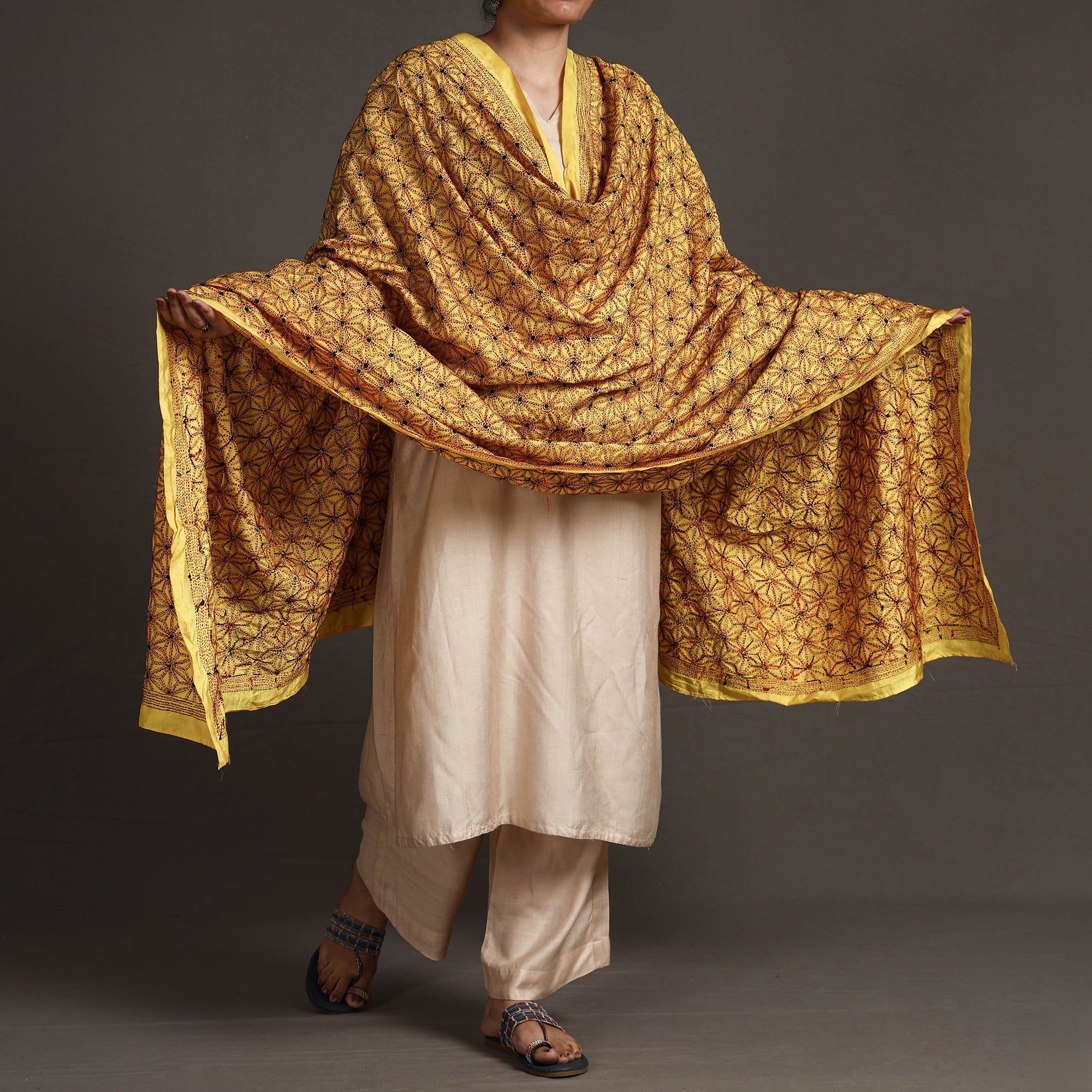 | Material | Fine-quality bengal Kantha mulberry silk dupatta is intricately designed with contemporary patterns and has been hand embroidered using West Bengal's traditional craft technique of Kantha. |