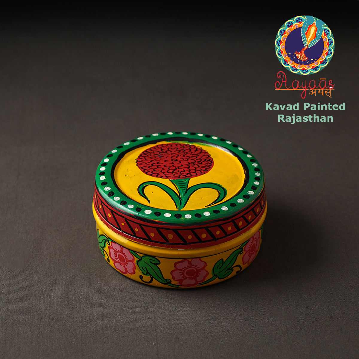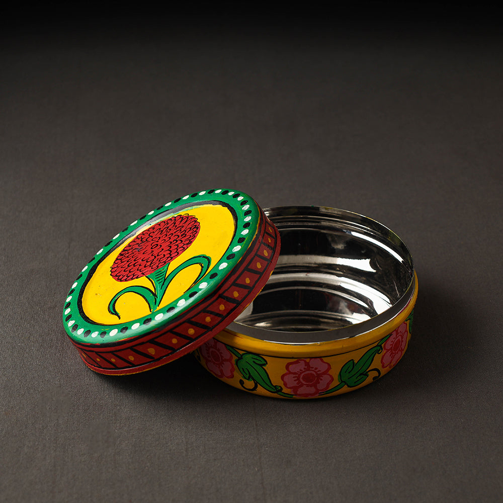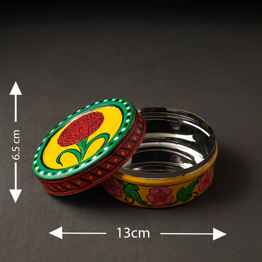 The yellow kavad handpainted stainless steel multi-utility container, made by skilled artisans from Mewar, Rajasthan, With its spacious interior and durable construction, it's perfect for storing spices, herbs, or any other kitchen essentials. A beautiful and practical addition to your kitchen