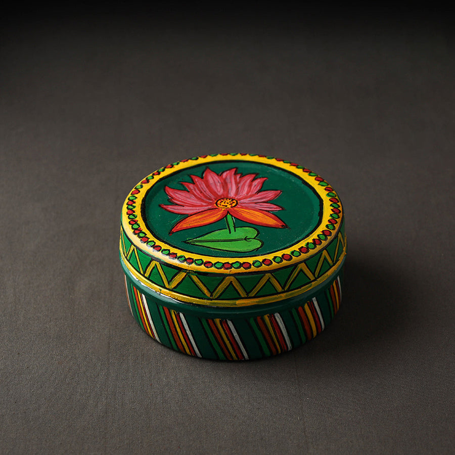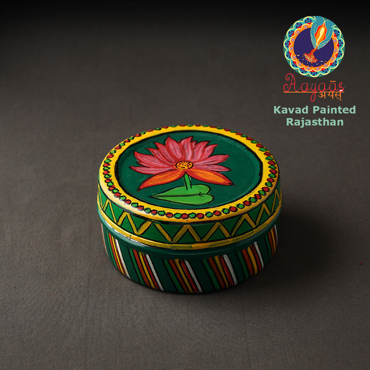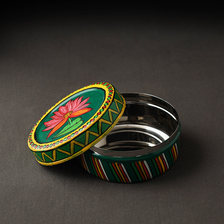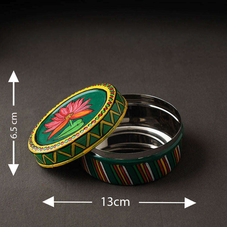 The Green kavad handpainted stainless steel multi-utility container, made by skilled artisans from Mewar, Rajasthan, With its spacious interior and durable construction, it's perfect for storing spices, herbs, or any other kitchen essentials. A beautiful and practical addition to your kitchen
