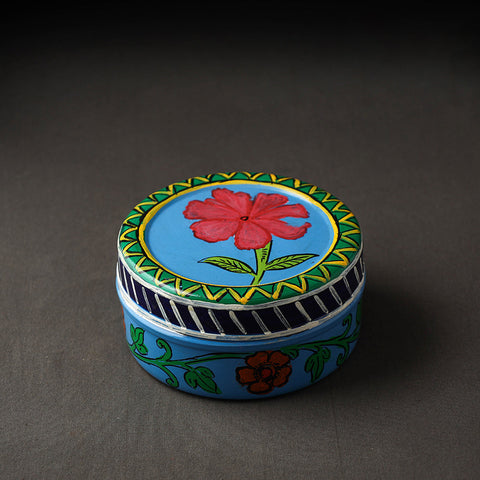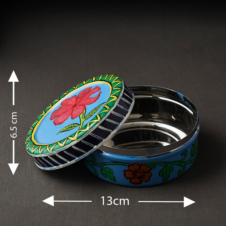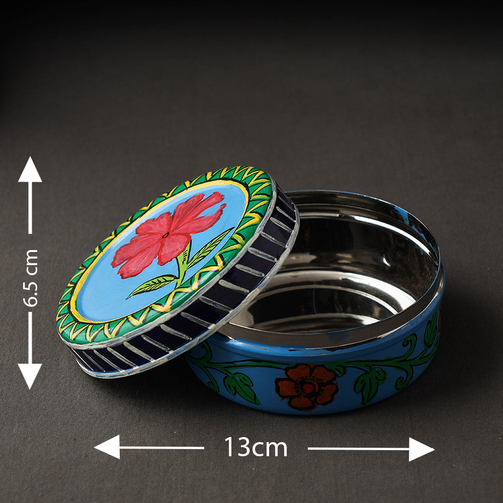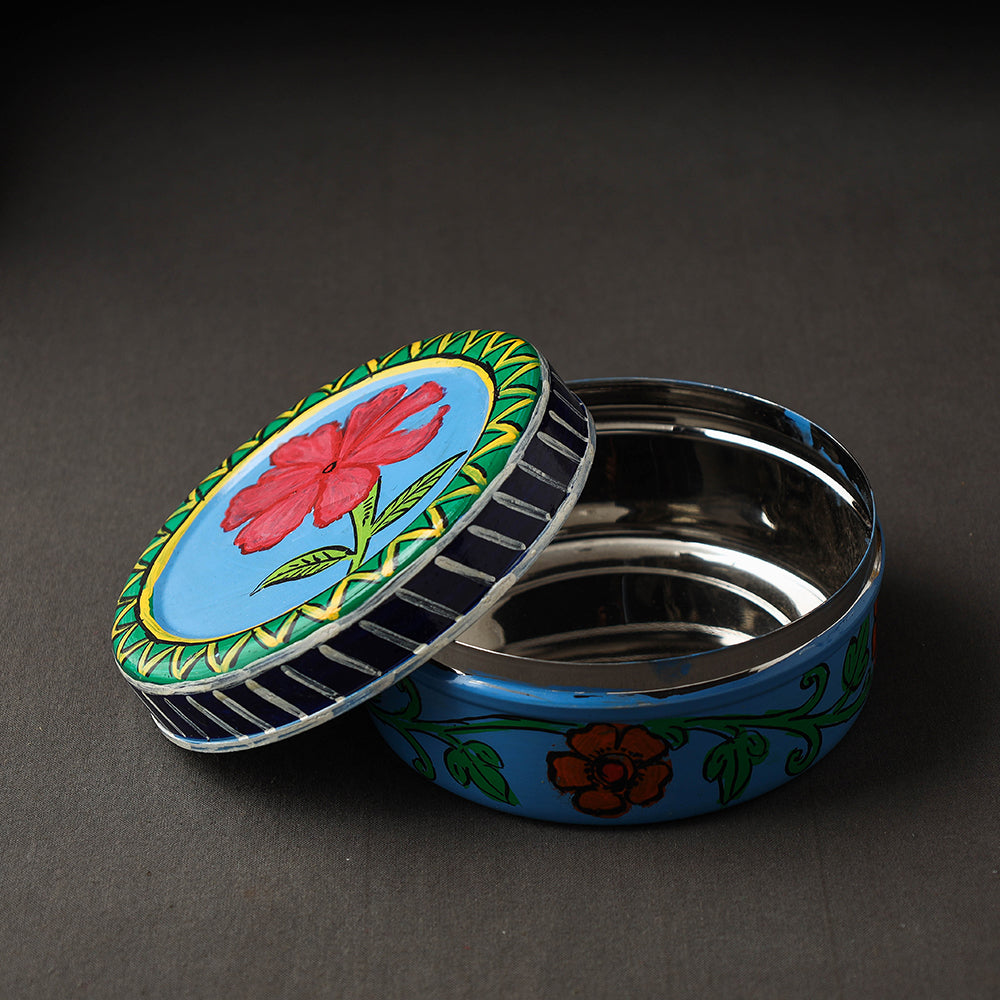 The blue kavad handpainted stainless steel multi-utility container, made by skilled artisans from Mewar, Rajasthan, With its spacious interior and durable construction, it's perfect for storing spices, herbs, or any other kitchen essentials. A beautiful and practical addition to your kitchen