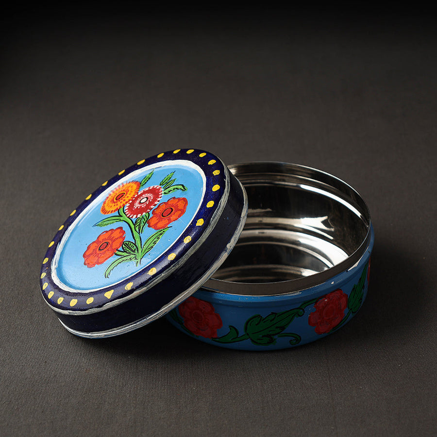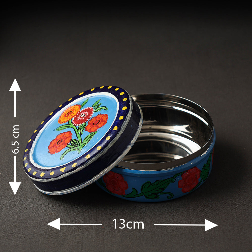 The blue kavad handpainted stainless steel multi-utility container, made by skilled artisans from Mewar, Rajasthan, With its spacious interior and durable construction, it's perfect for storing spices, herbs, or any other kitchen essentials. A beautiful and practical addition to your kitchen