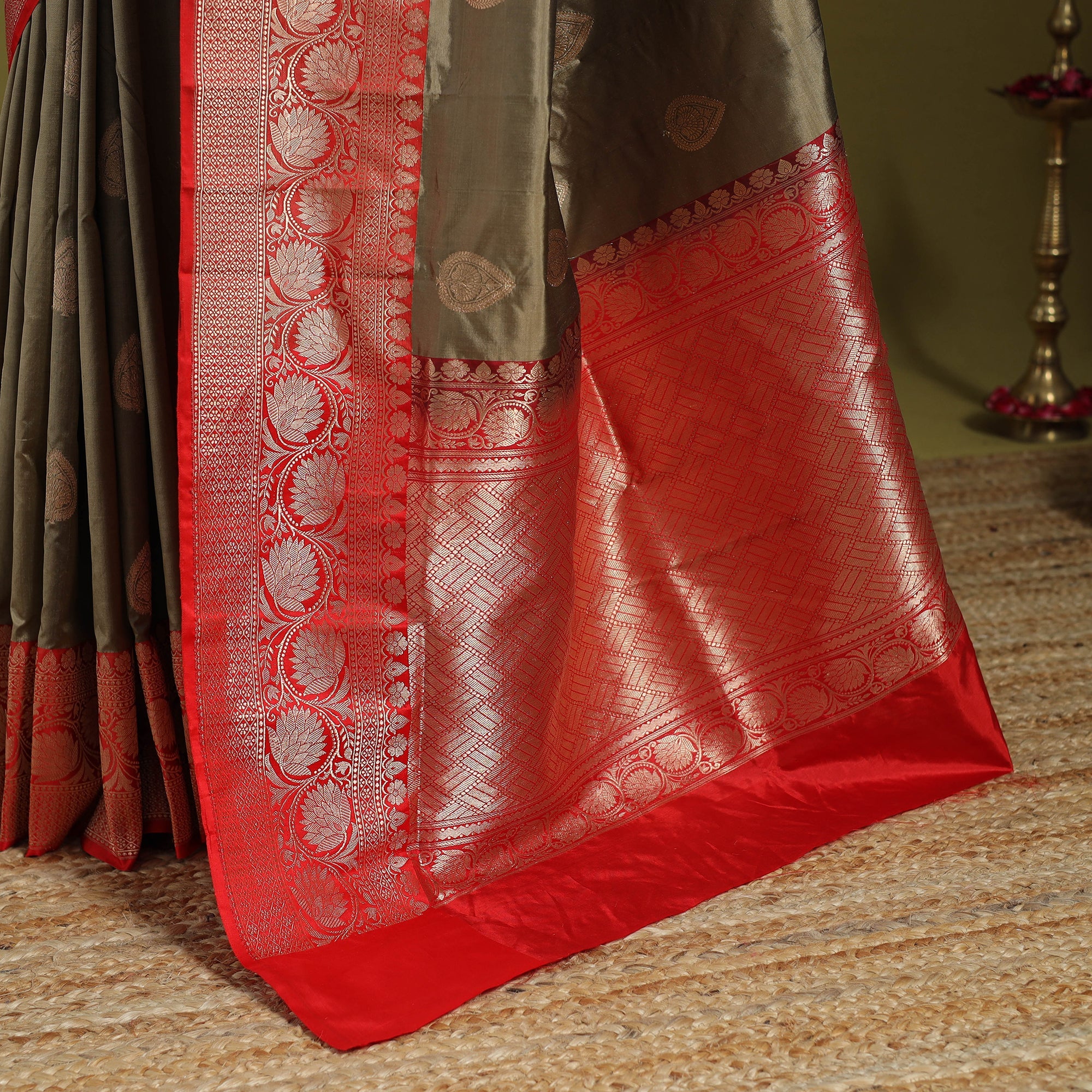 This exquisite brown banarasi handloom kaduwa zari buti saree is made from pure katan silk. Meticulously woven using traditional techniques, these sarees showcase the skilled craftsmanship of Banaras. The intricate kaduwa zari buti work enhances the overall beauty of the saree, adding a touch of grandeur to every drape. This collection of Banarasi sarees from Banaras is going to be a beautiful addition to your wardrobe. In vibrant jewel tones, the sarees have intricately woven motifs.