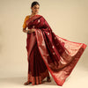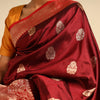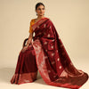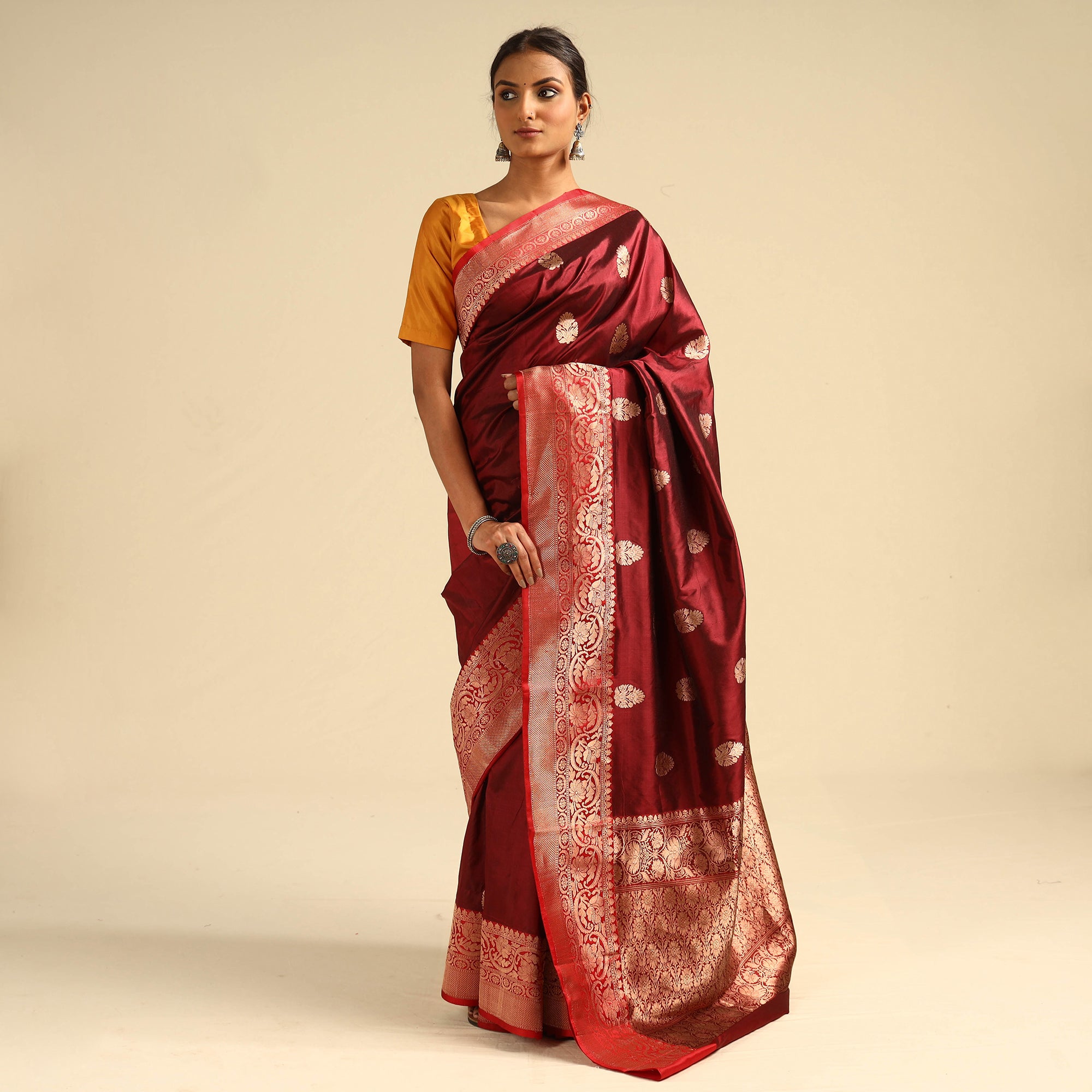 This exquisite maroon banarasi handloom kaduwa zari buti saree is made from pure katan silk. Meticulously woven using traditional techniques, these sarees showcase the skilled craftsmanship of Banaras. The intricate kaduwa zari buti work enhances the overall beauty of the saree, adding a touch of grandeur to every drape. This collection of Banarasi sarees from Banaras is going to be a beautiful addition to your wardrobe. In vibrant jewel tones, the sarees have intricately woven motifs.