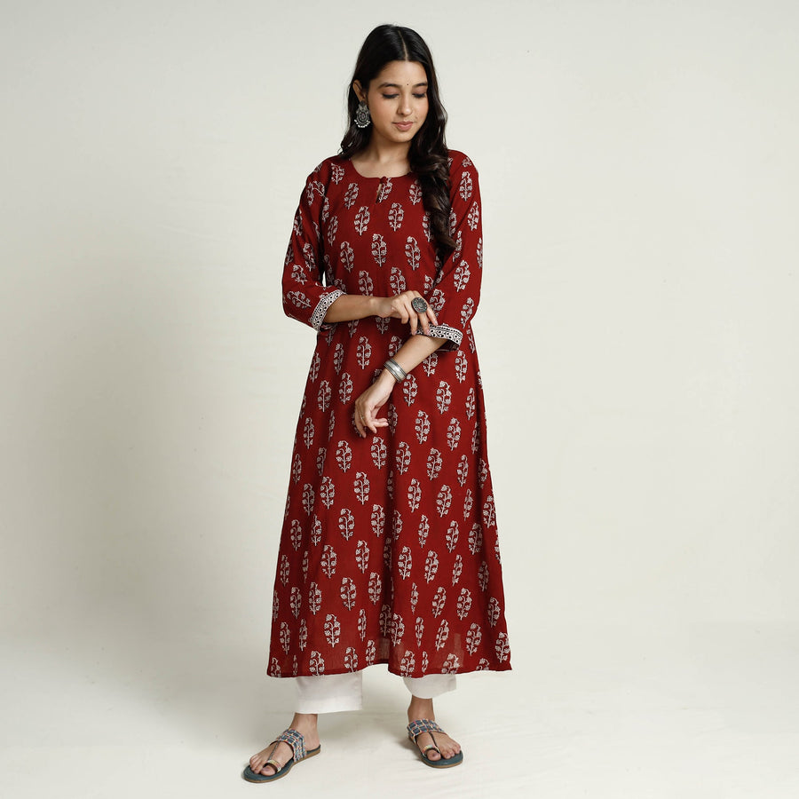 Look and feel beautiful in this uniquely designed red block print mul cotton a-line bagh kurta. Designed for all-day comfort, the soft and breathable mul cotton fabric ensures you stay cool and comfortable, making it ideal for daily wear. Complete with a side pocket, it offers both functionality and fashion-forward appeal. Perfect for both casual outings and special occasions.