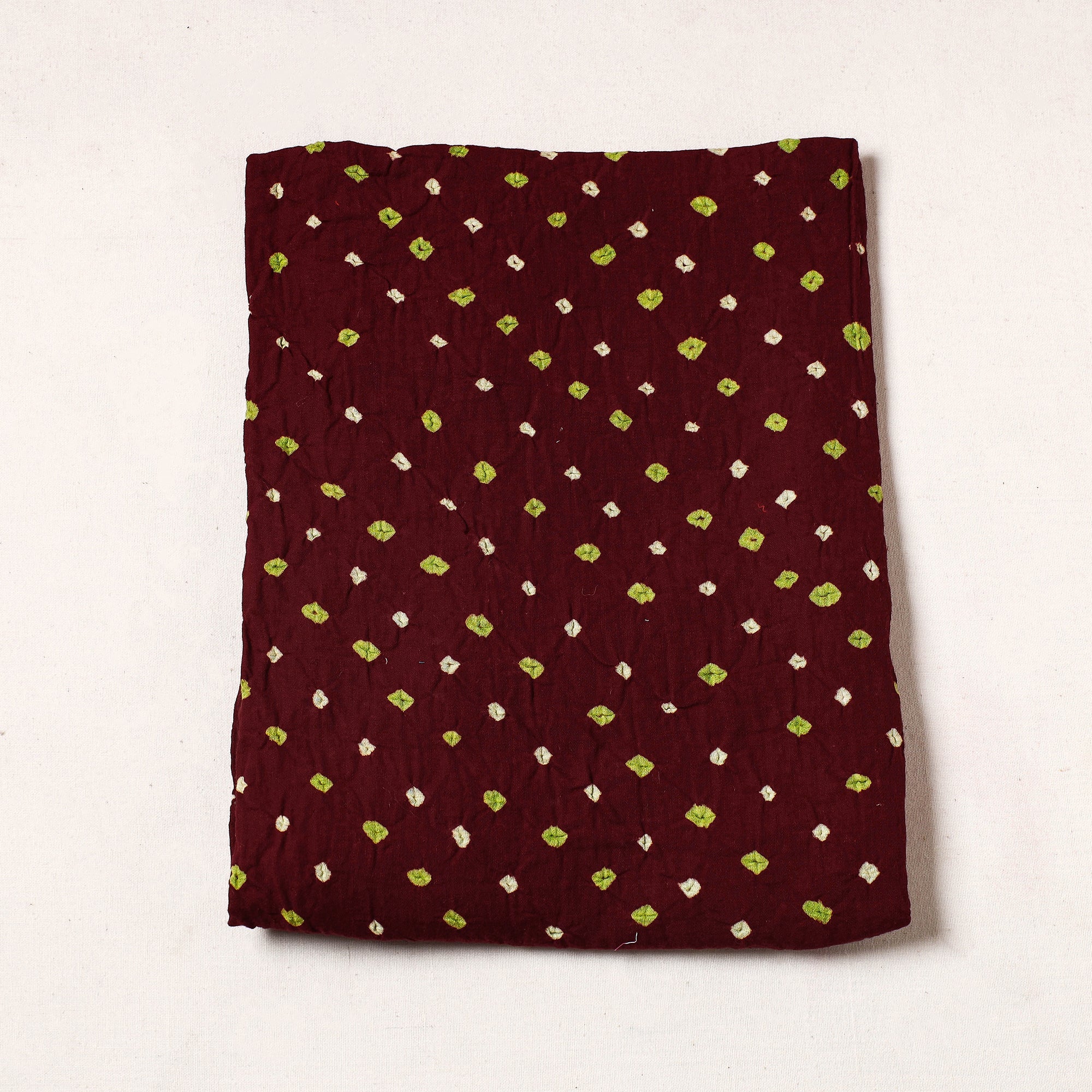 Fine quality kutch bandhani tie-dye satin cotton precut fabric featuring majestic bandhani pattern, tie-dyed using the traditional technique practised by the artisans of Kutch. The art of Bandhani is highly skilled process. The technique involves dyeing a fabric which is tied tightly with a thread at several points.
