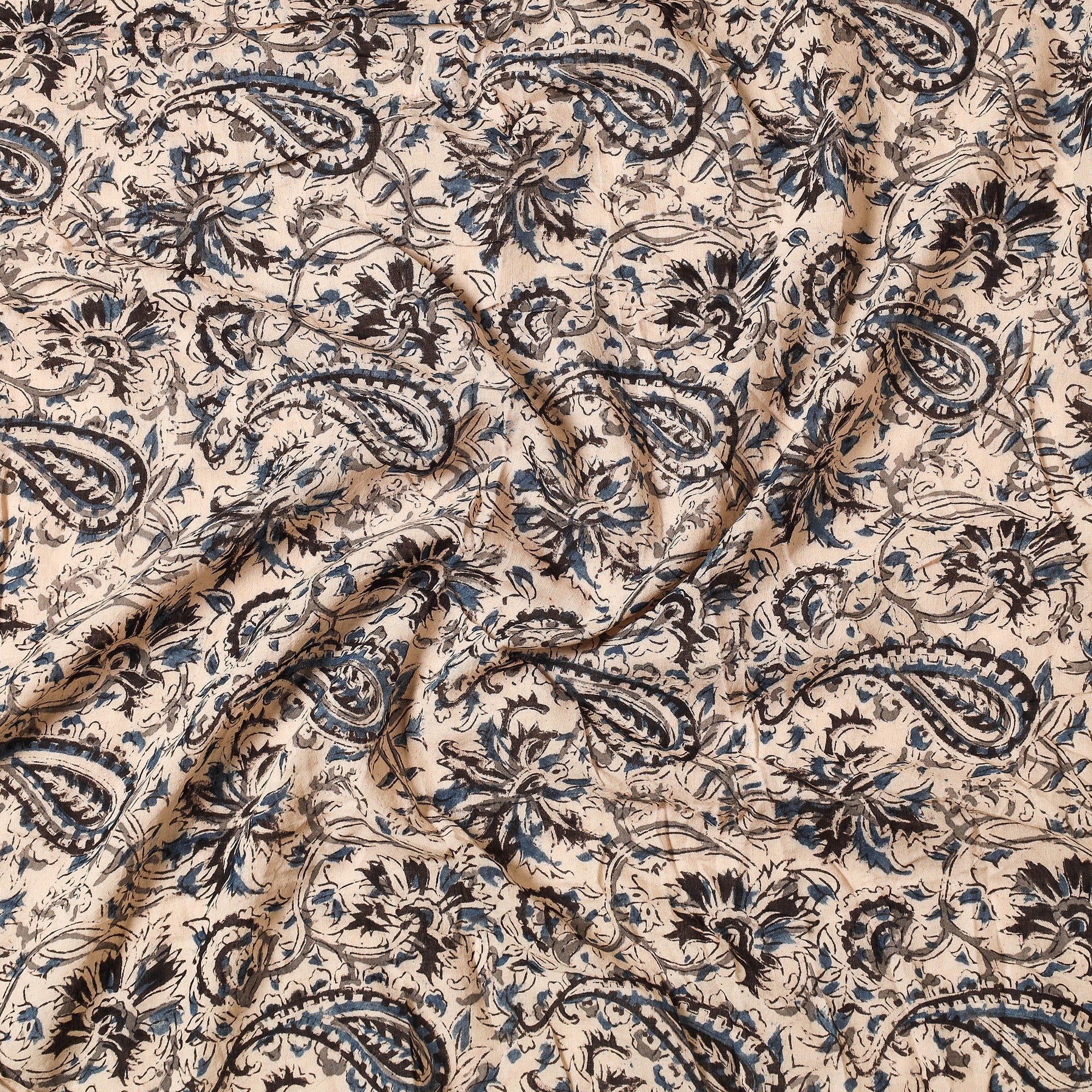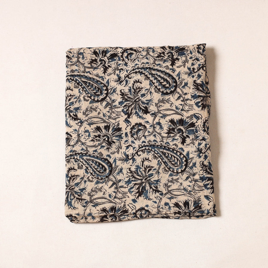 Fine quality beige kalamkari hand block printed cotton precut fabric made using natural dyes through traditional process of hand block printing practised by the artisans of Andhra Pradesh. Kalamkari is the earliest and more complex techniques of block-printing. Showcasing an assortment of hand block printed motifs inspired by traditional kalamkari painting.