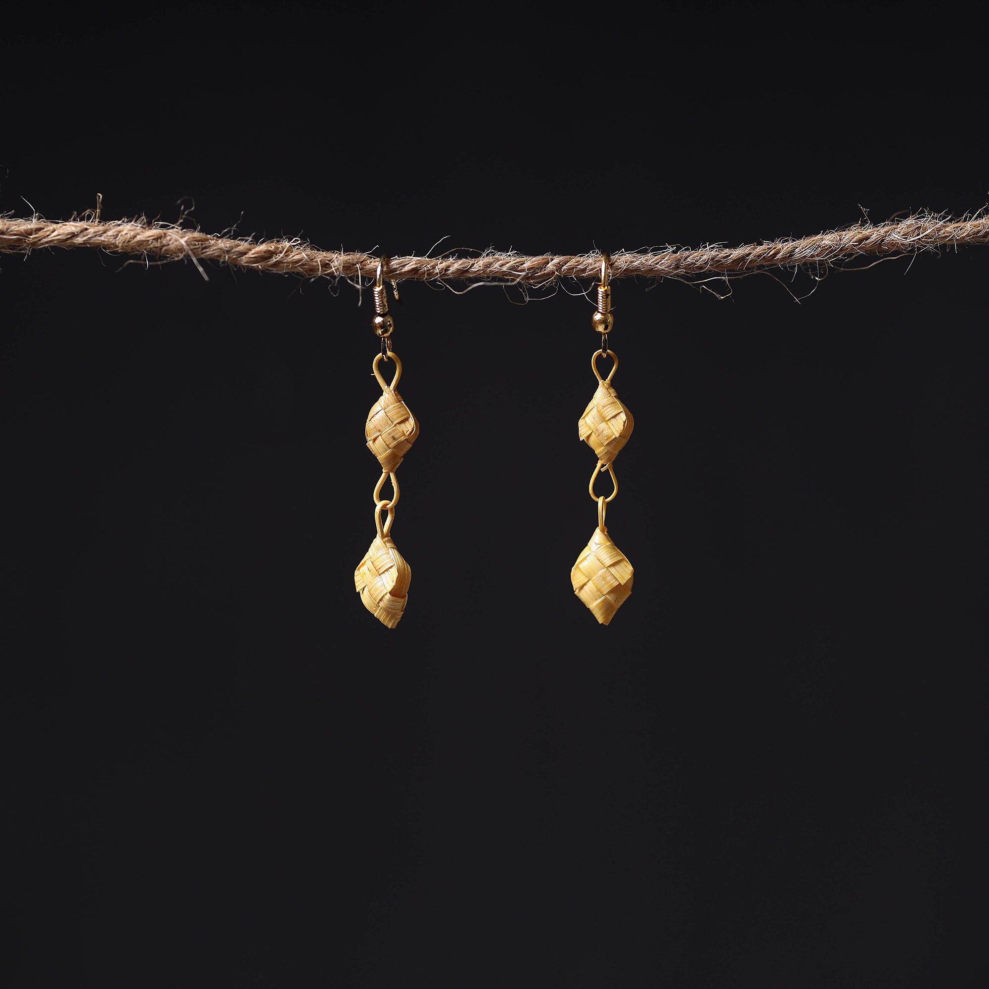 Yellow handmade bamboo craft earrings, made from locally sourced variety of manvel bamboo crafted by tribal artisans of Raigad, Maharashtra.