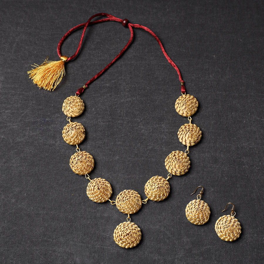 Beige handmade bamboo craft necklace set, made from locally sourced variety of manvel bamboo crafted by tribal artisans of Raigad, Maharashtra.