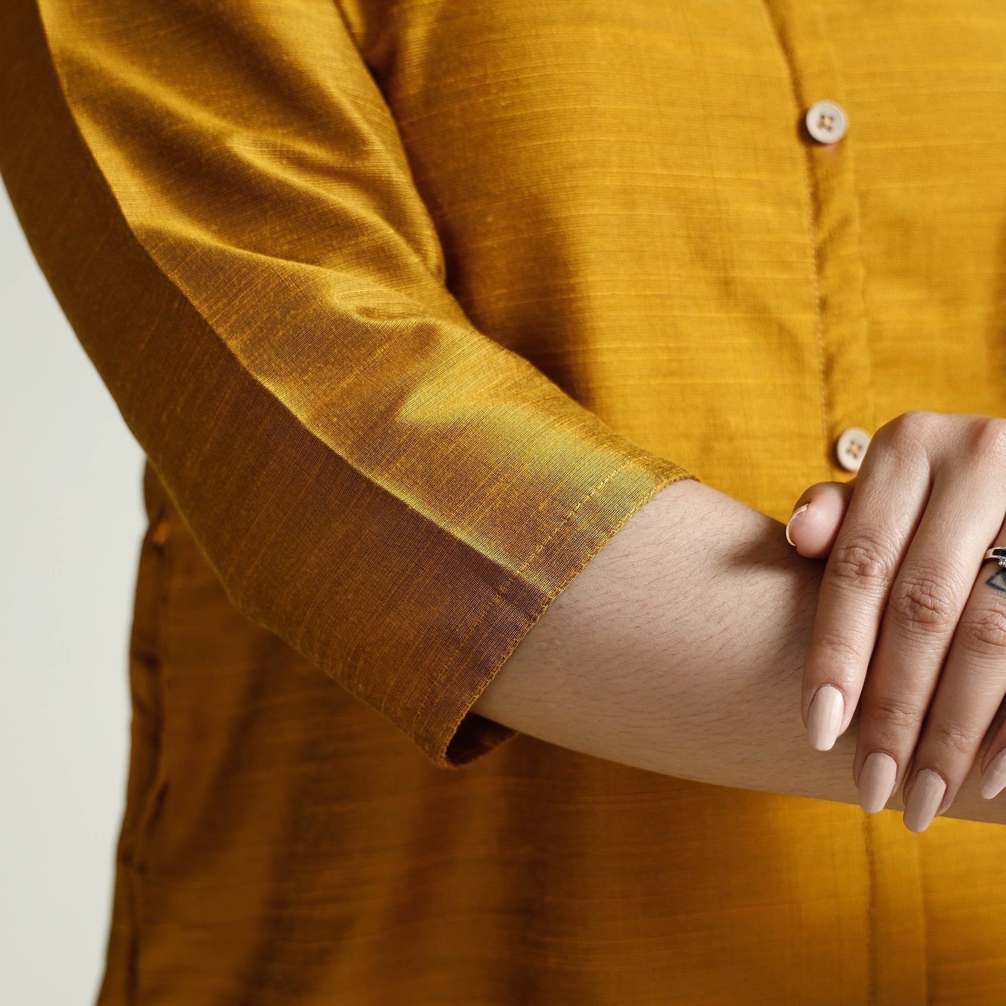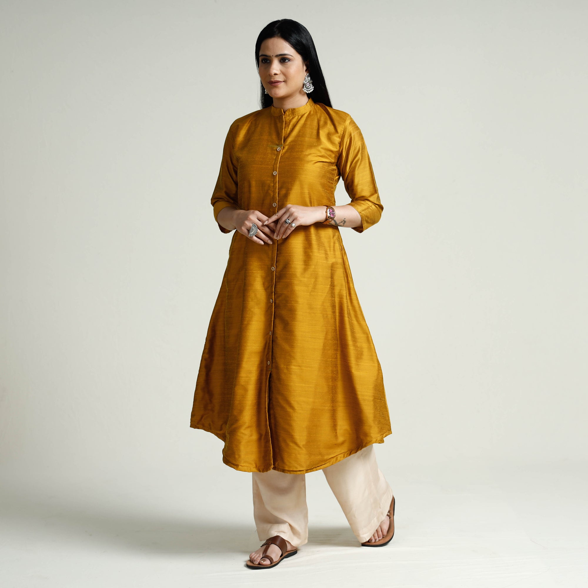 Look and feel beautiful in this uniquely designed plain dyed slub silk long kurta. This long kurta is crafted from high-quality slub silk fabric, ensuring a luxurious and comfortable feel against your skin. The kurta also features a convenient one-side pocket, perfect for carrying small essentials. It's an ideal choice for both casual and festive occasions.
