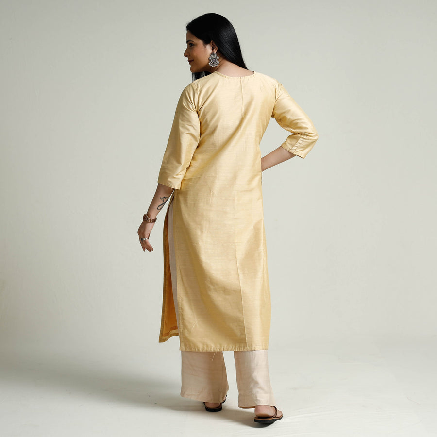 Look and feel beautiful in this uniquely designed pintuck plain dyed slub silk long kurta. This long kurta is crafted from high-quality slub silk fabric, ensuring a luxurious and comfortable feel against your skin. It boasts an exquisite pintuck design, adding a touch of elegance to your ensemble. The kurta also features a convenient one-side pocket, perfect for carrying small essentials. It's an ideal choice for both casual and festive occasions.