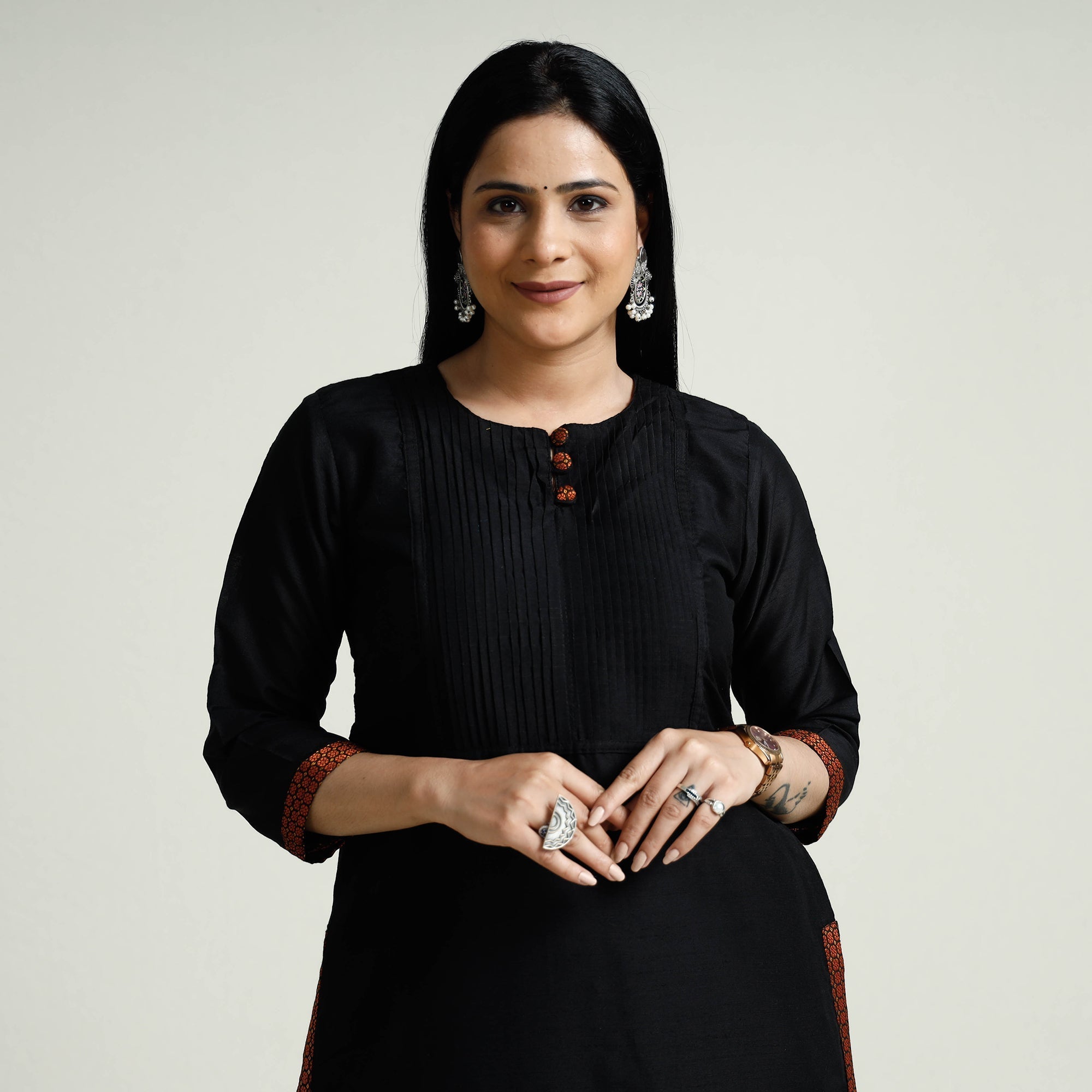 Look and feel beautiful in this uniquely designed pintuck plain dyed slub silk long kurta. This long kurta is crafted from high-quality slub silk fabric, ensuring a luxurious and comfortable feel against your skin. It boasts an exquisite pintuck design, adding a touch of elegance to your ensemble. The kurta also features a convenient one-side pocket, perfect for carrying small essentials. It's an ideal choice for both casual and festive occasions.