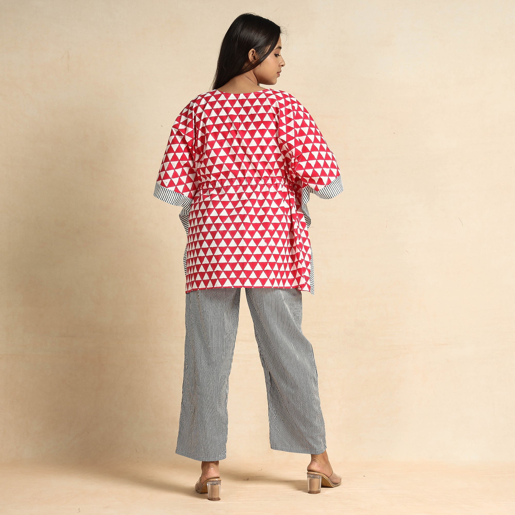 Fine quality hand screen printed cotton night suit / loungewear. This suit consists of a short tie-up cotton kaftan paired with an elasticated pyjama. These cotton night suits are enhanced by beautiful hand prints. This outfit allows you to move and sleep with ease and comfort and is stylish enough to lounge in! The drawstring, elasticated tie-up waist will give you the freedom to customize the fit to suit your unique shape.