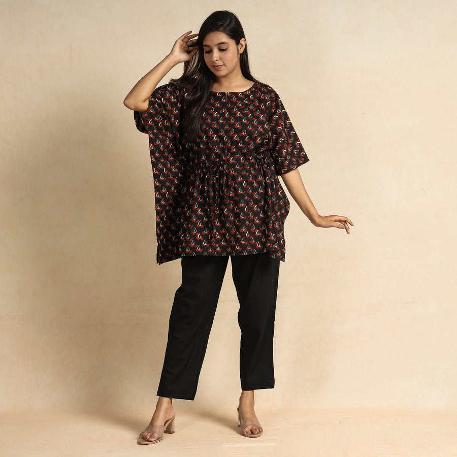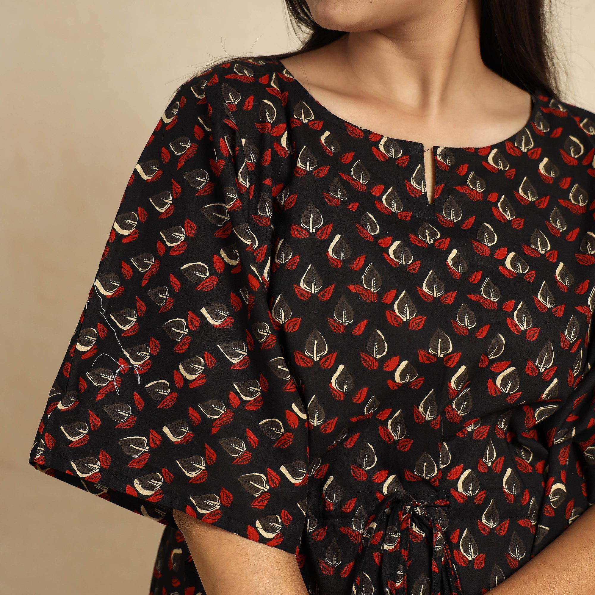 Fine quality bagru hand-block printed cotton night suit / loungewear. This suit consists of a short tie-up cotton kaftan paired with an elasticated pyjama. These cotton night suits are enhanced by beautiful hand-block prints. This outfit allows you to move and sleep with ease and comfort and is stylish enough to lounge in! The drawstring, elasticated tie-up waist will give you the freedom to customize the fit to suit your unique shape.