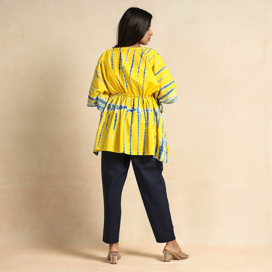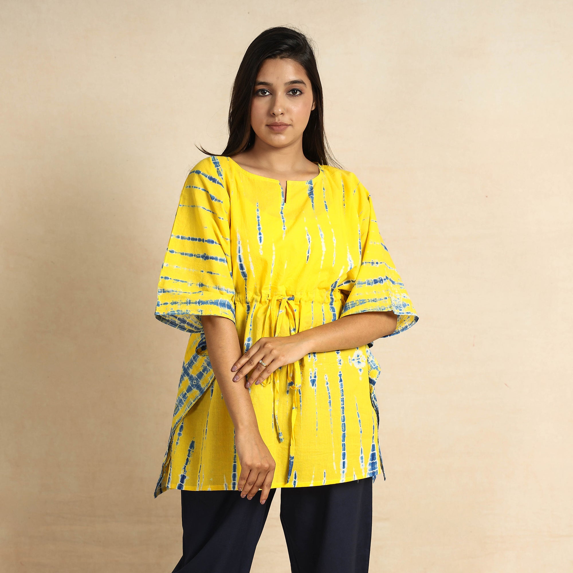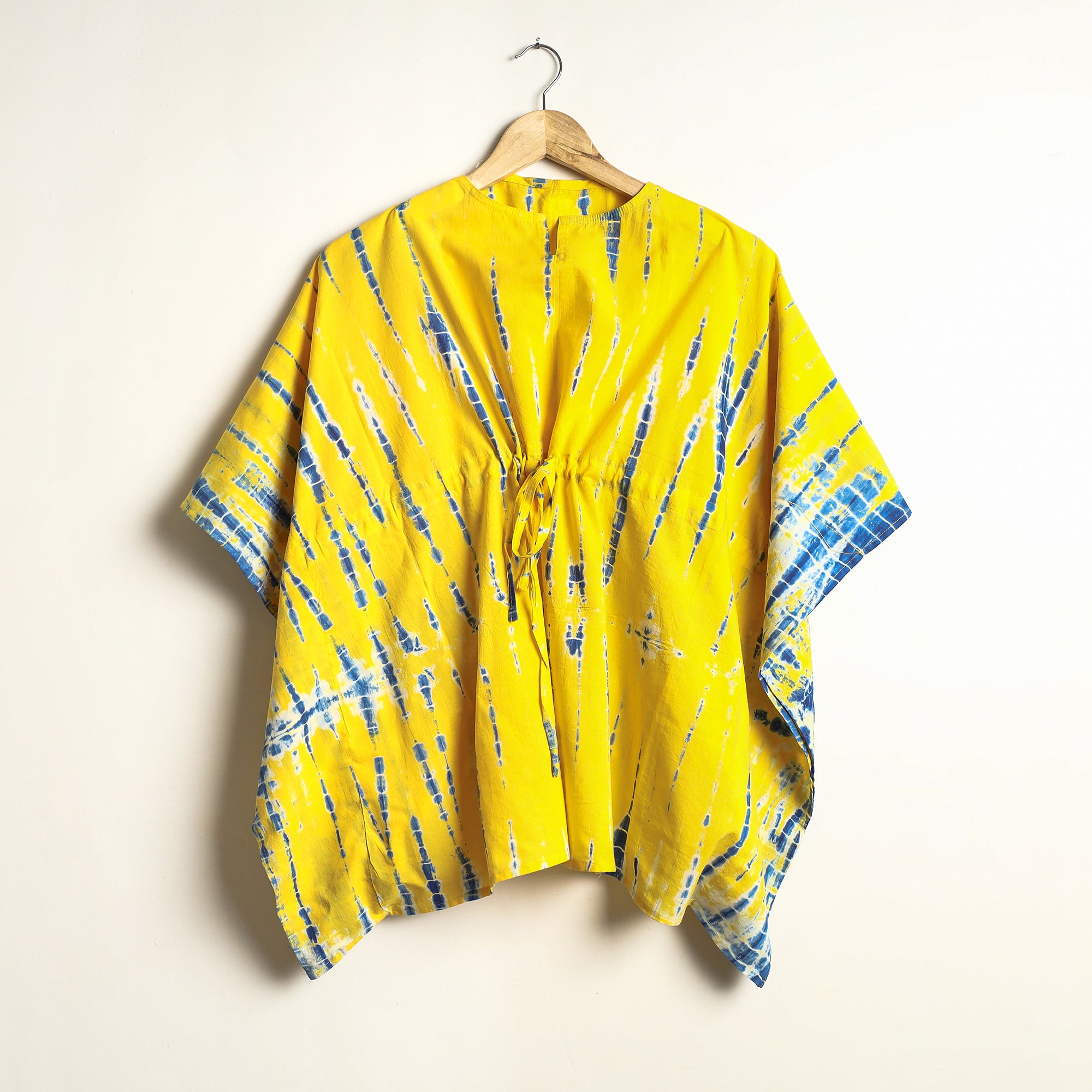 Fine quality shibori tie-dye cotton night suit / loungewear. This suit consists of a short tie-up cotton kaftan paired with an elasticated pyjama. These cotton night suits are enhanced by beautiful shibori tie-dye pattern. This outfit allows you to move and sleep with ease and comfort and is stylish enough to lounge in! The drawstring, elasticated tie-up waist will give you the freedom to customize the fit to suit your unique shape.