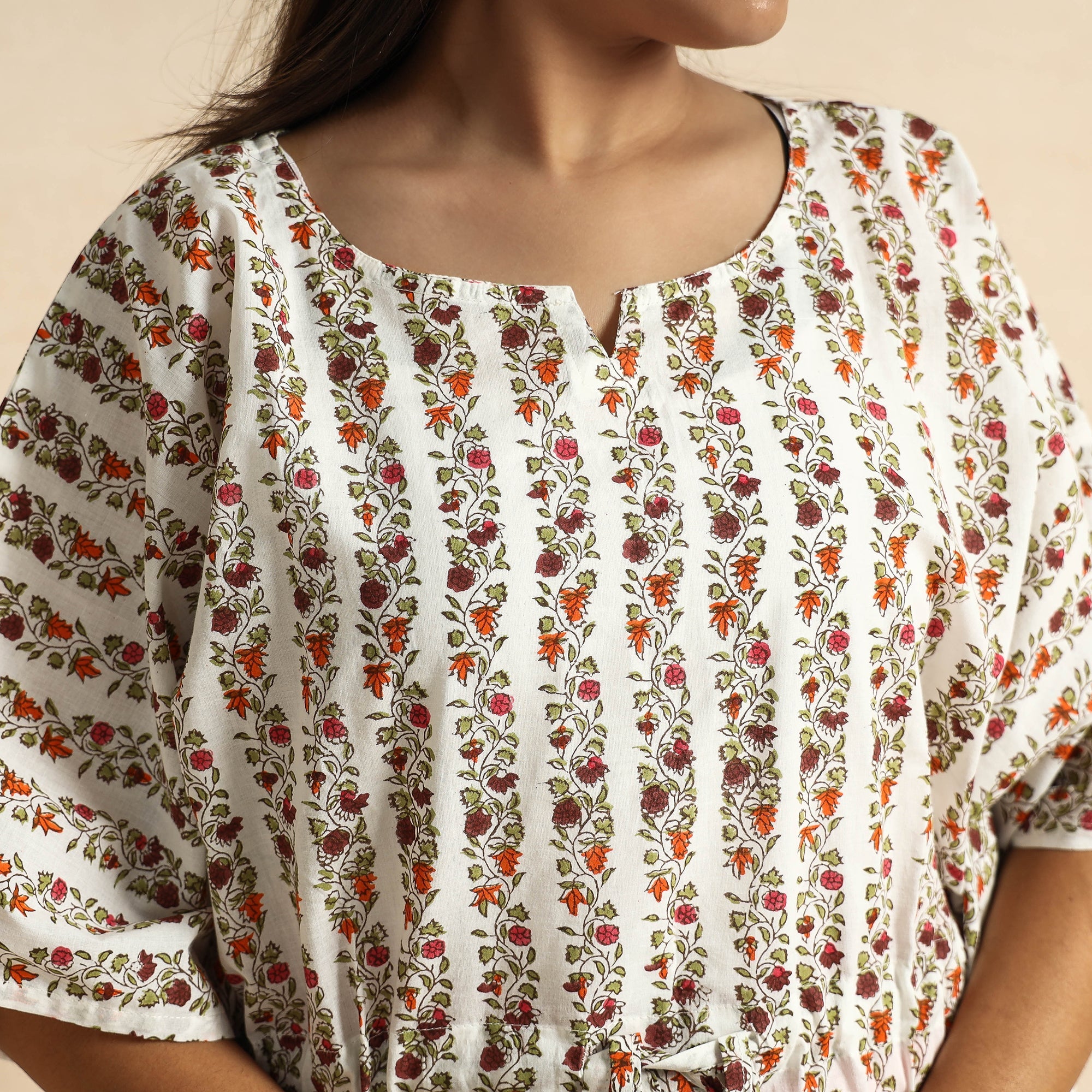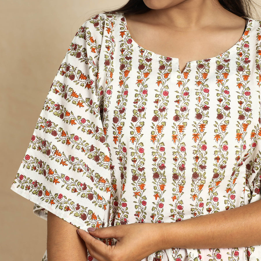Fine quality sanganeri hand-block printed cotton night suit / loungewear. This suit consists of a short tie-up cotton kaftan paired with an elasticated pyjama. These cotton night suits are enhanced by beautiful hand-block prints. This outfit allows you to move and sleep with ease and comfort and is stylish enough to lounge in! The drawstring, elasticated tie-up waist will give you the freedom to customize the fit to suit your unique shape.