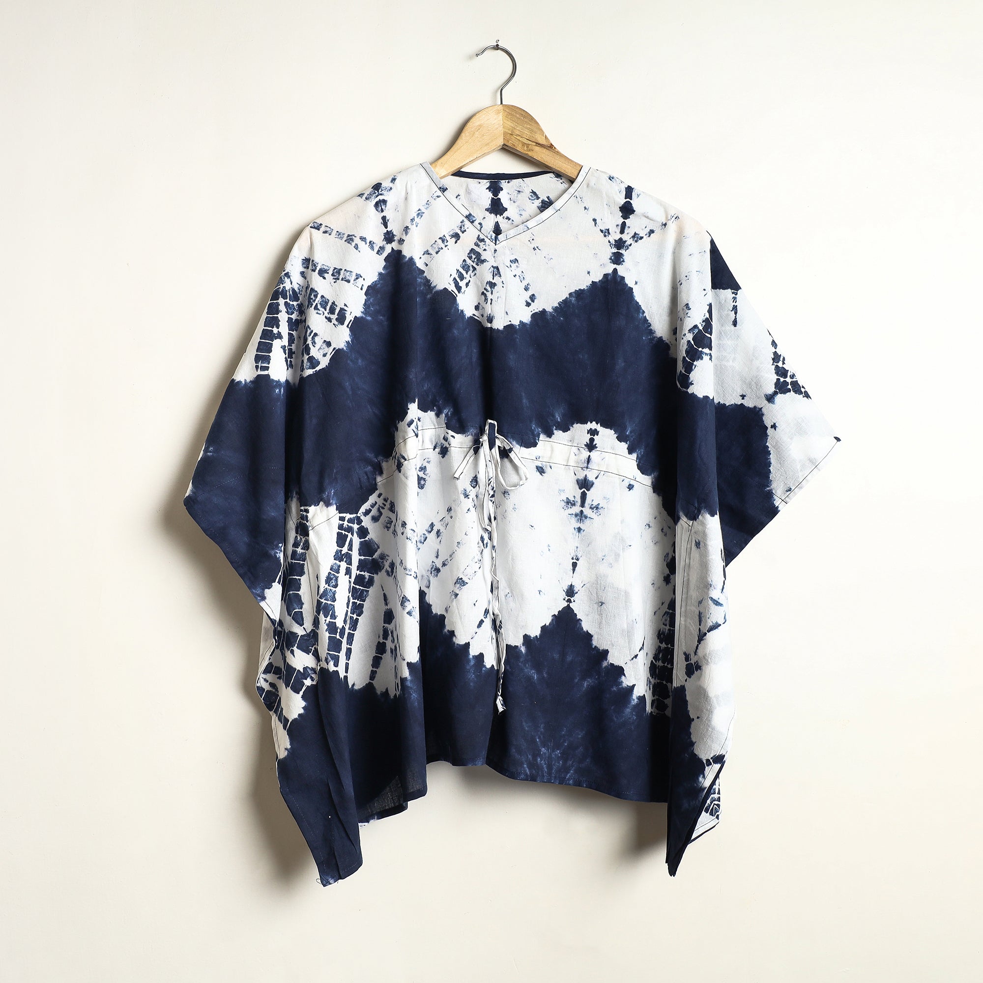 Fine quality blue shibori tie-dye cotton night suit / loungewear. This suit consists of a short tie-up cotton kaftan paired with an elasticated pyjama. These cotton night suits are enhanced by beautiful shibori tie-dye pattern. This outfit allows you to move and sleep with ease and comfort and is stylish enough to lounge in! The drawstring, elasticated tie-up waist will give you the freedom to customize the fit to suit your unique shape.