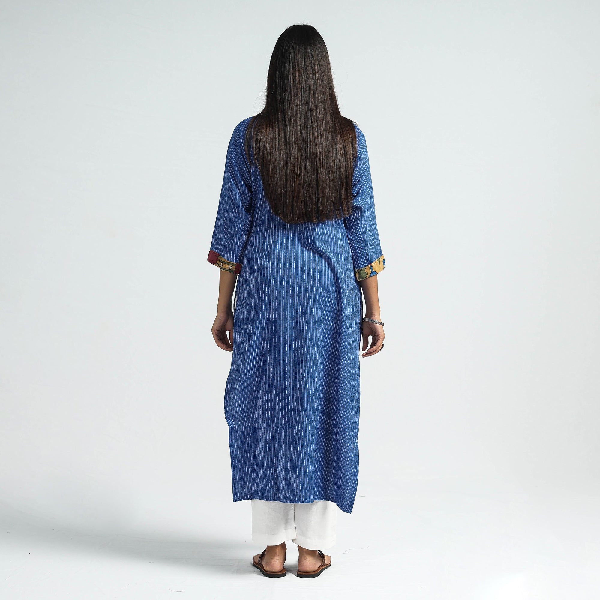 Look and feel beautiful in this uniquely designed running stitch plain cotton long kurta. This long kurta is crafted from fine-quality cotton fabric, ensuring a comfortable feel against your skin. It boasts an exquisite srikalahasti kalamkari patchwork design, adding a touch of elegance to your ensemble. The kurta also features a convenient one-side pocket, perfect for carrying small essentials. It's an ideal choice for both casual and festive occasions.