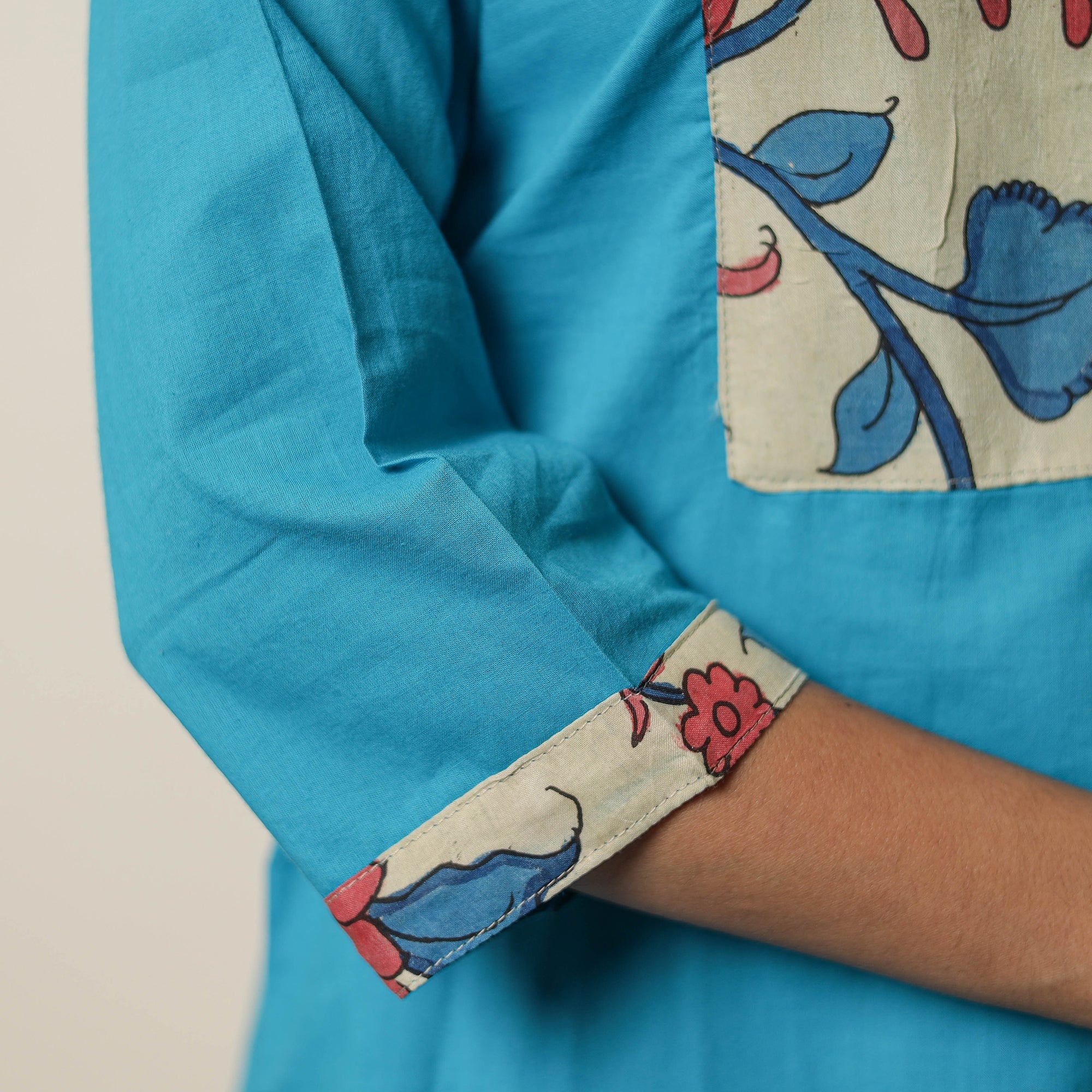 Look and feel beautiful in this uniquely designed plain cotton long kurta. This long kurta is crafted from fine-quality cotton fabric, ensuring a comfortable feel against your skin. It boasts an exquisite srikalahasti kalamkari patchwork design, adding a touch of elegance to your ensemble. The kurta also features a convenient one-side pocket, perfect for carrying small essentials. It's an ideal choice for both casual and festive occasions.