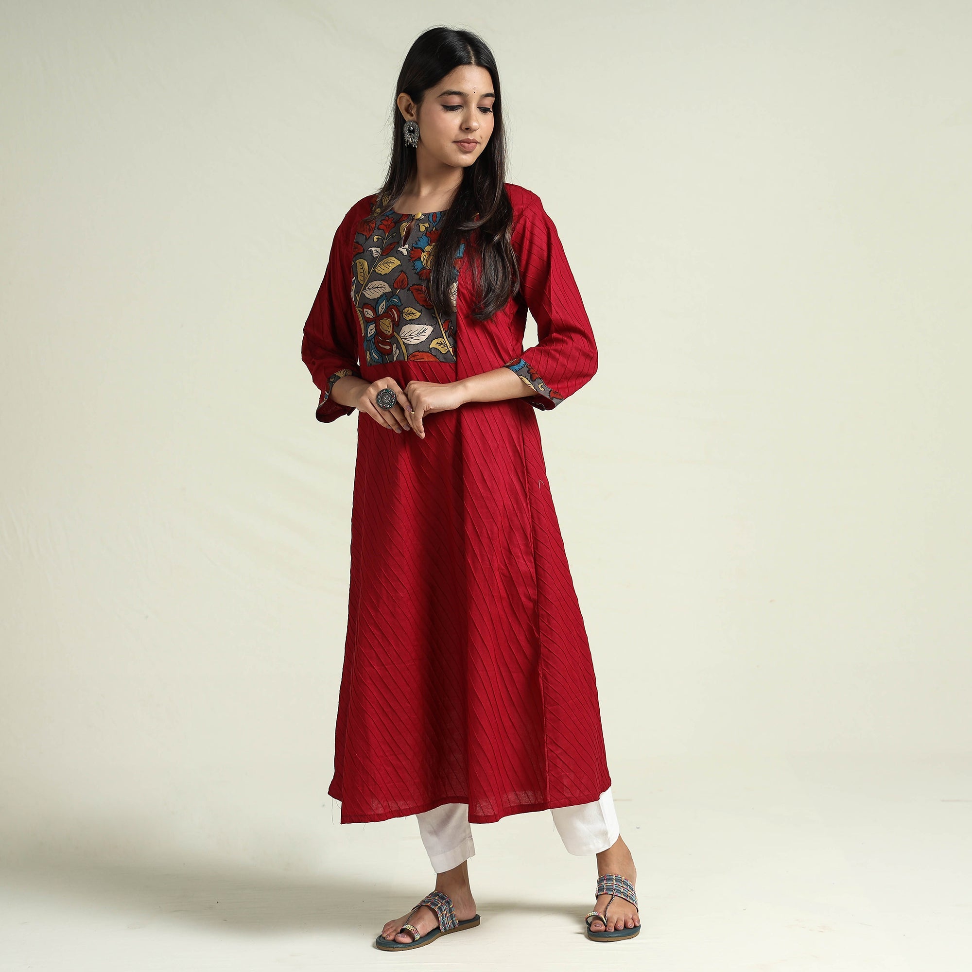 Look and feel beautiful in this uniquely designed pintuck plain cotton long Kurta. This long Kurta is crafted from fine-quality cotton fabric, ensuring a comfortable feel against your skin. It boasts an exquisite srikalahasti kalamkari patchwork design, adding a touch of elegance to your ensemble. The Kurta also features a convenient one-side pocket, perfect for carrying small essentials. It's an ideal choice for both casual and festive occasions.
